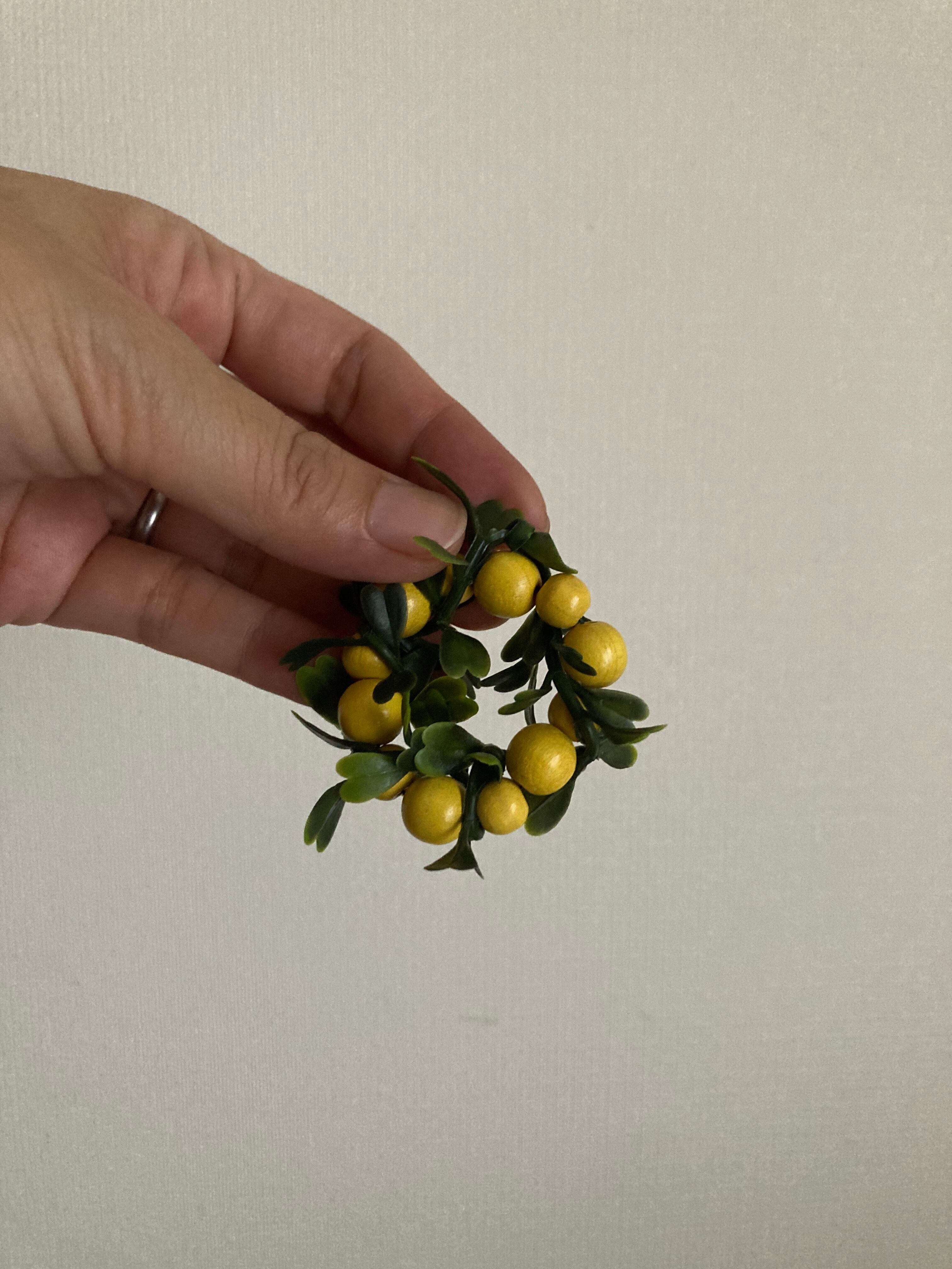 こちらは、小さな木のお人形2点と、葉っぱが巻かれたウッドビーズのリース(葉っぱはプラスチック製)の3点セットになります。リースに通して飾れる布のリボン付き♫