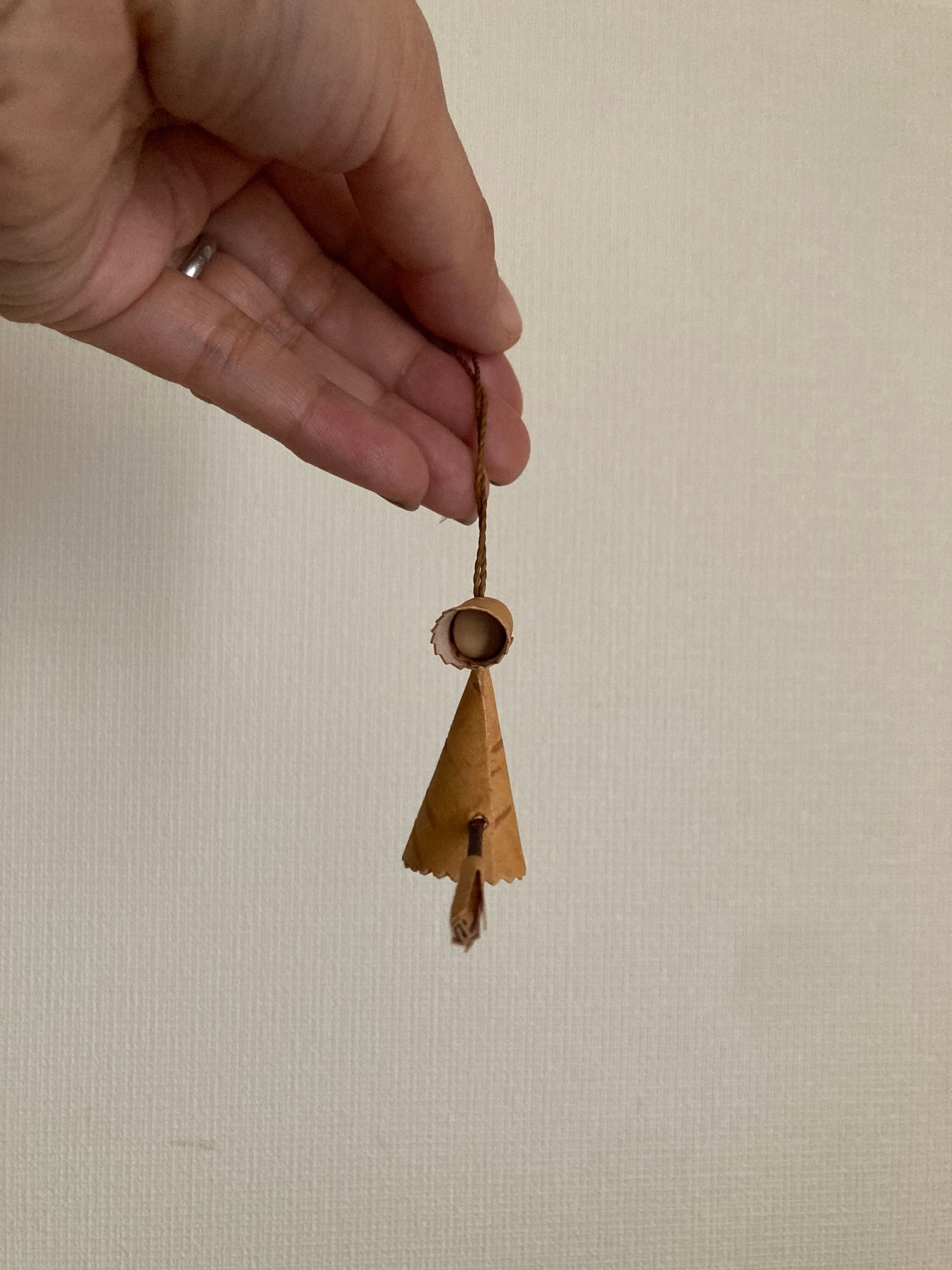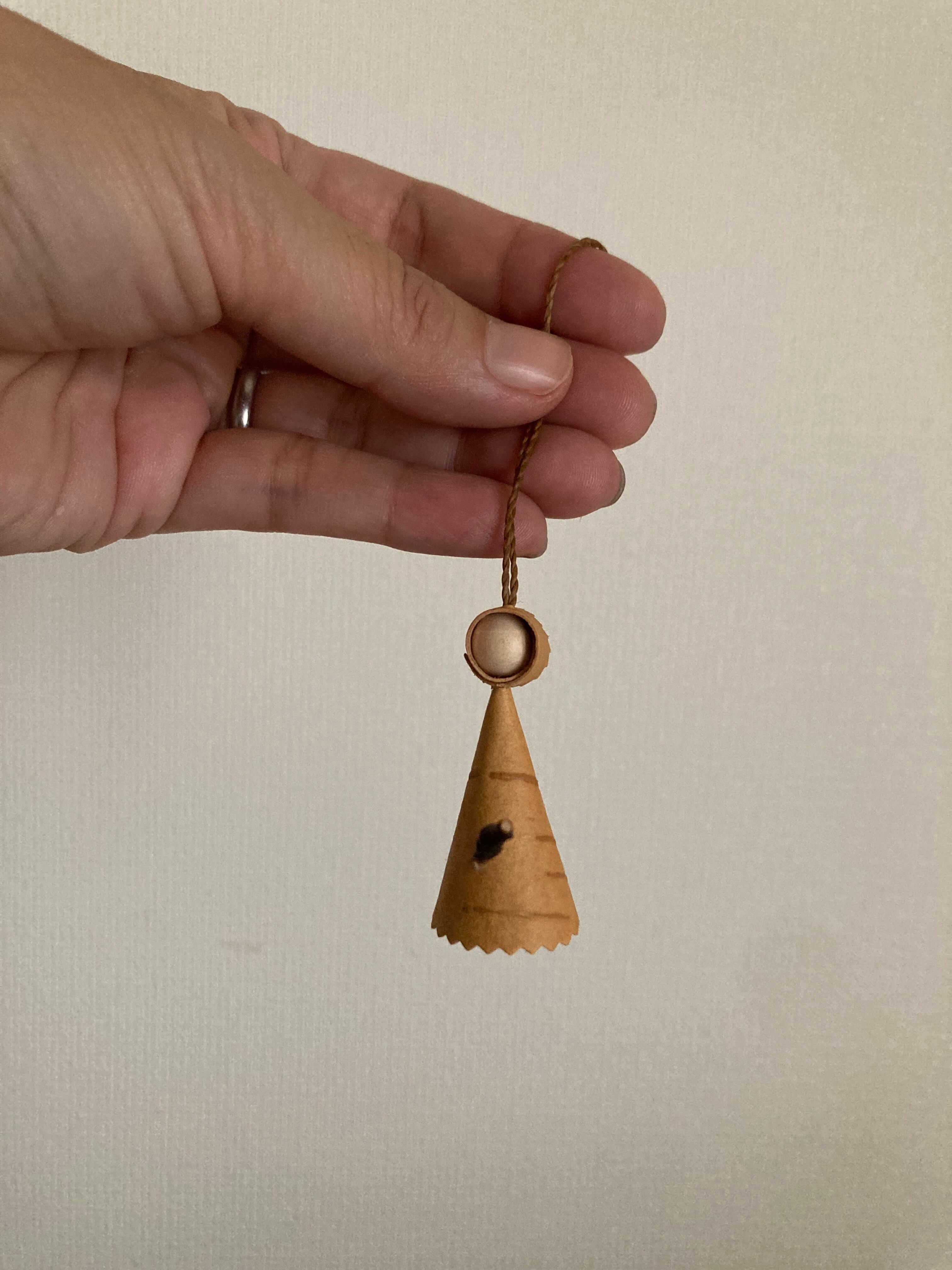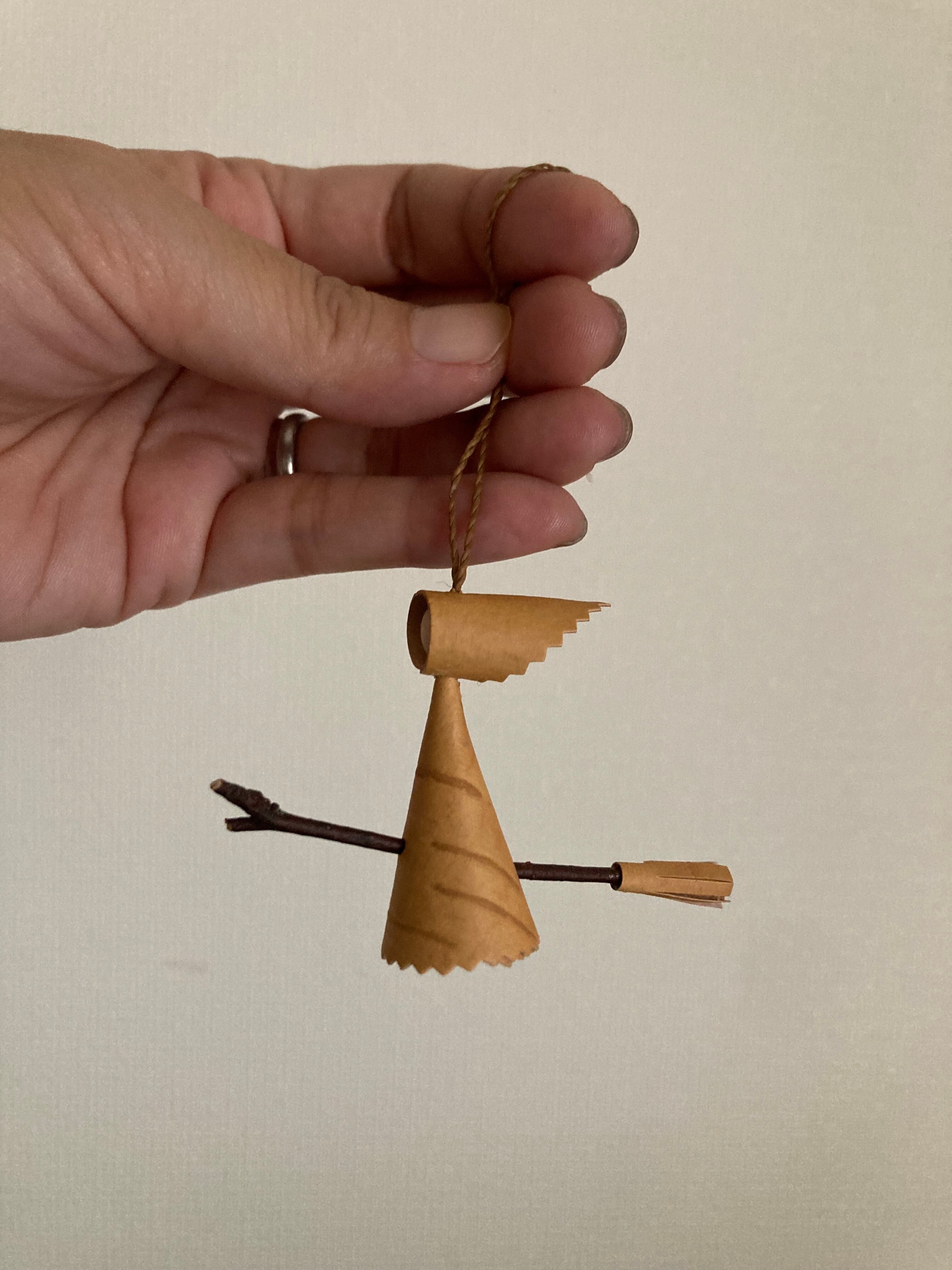 魔女の顔はウッドビーズ、スカーフと体は白樺樹皮、ホウキは白樺の枝になります。