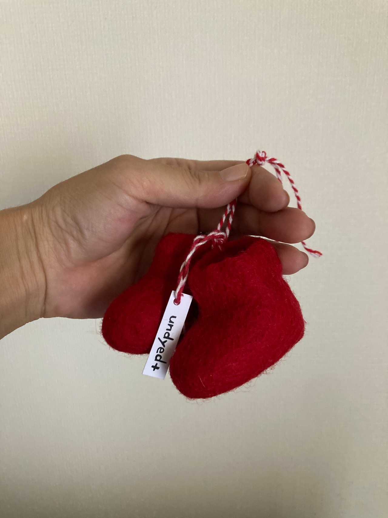 羊毛100%のフェルトのオーナメントとフェルトのブーツ(赤バージョンは赤ブーツ・グレーバージョンは白ブーツ)のオーナメントも付属しています。