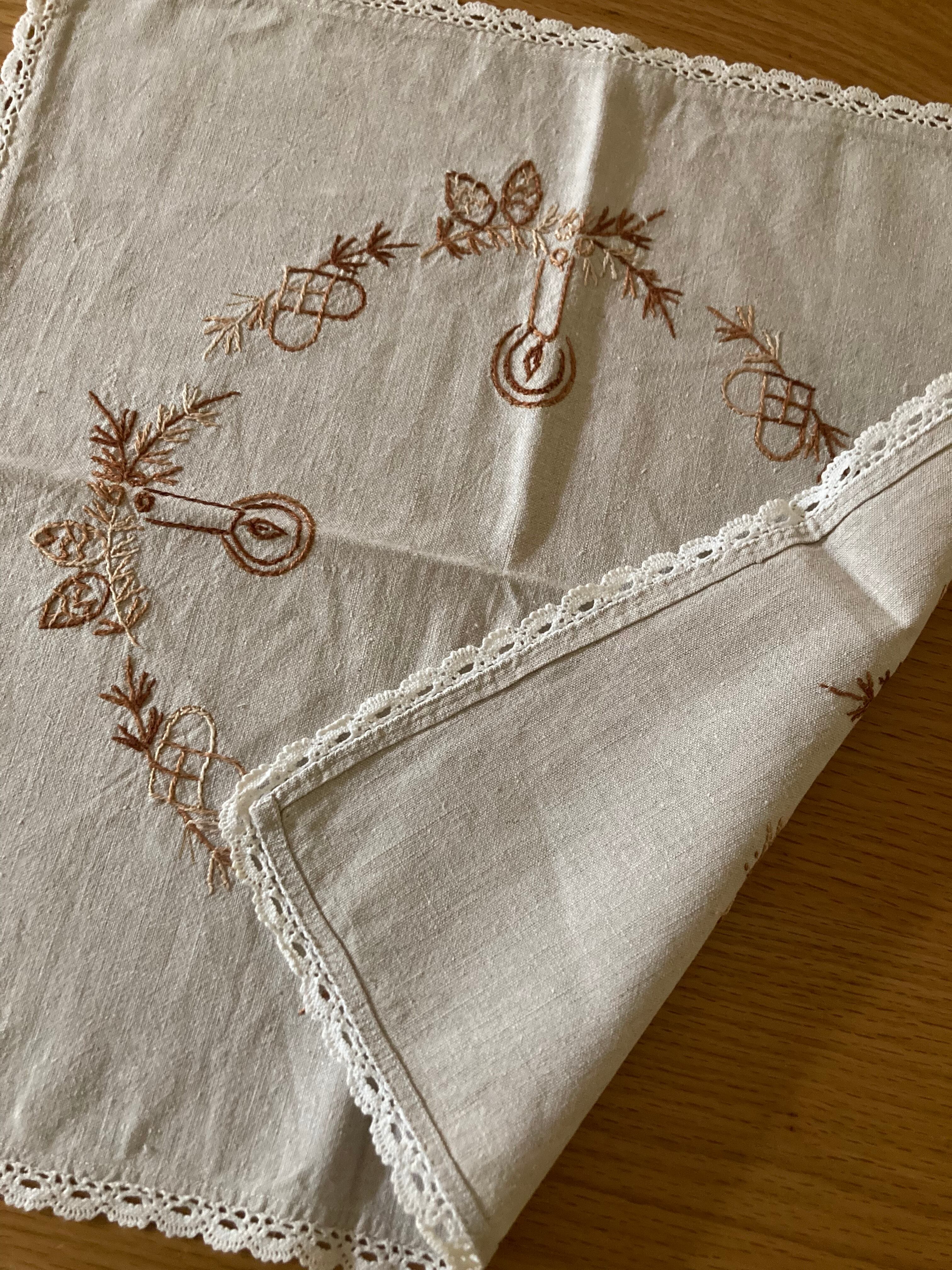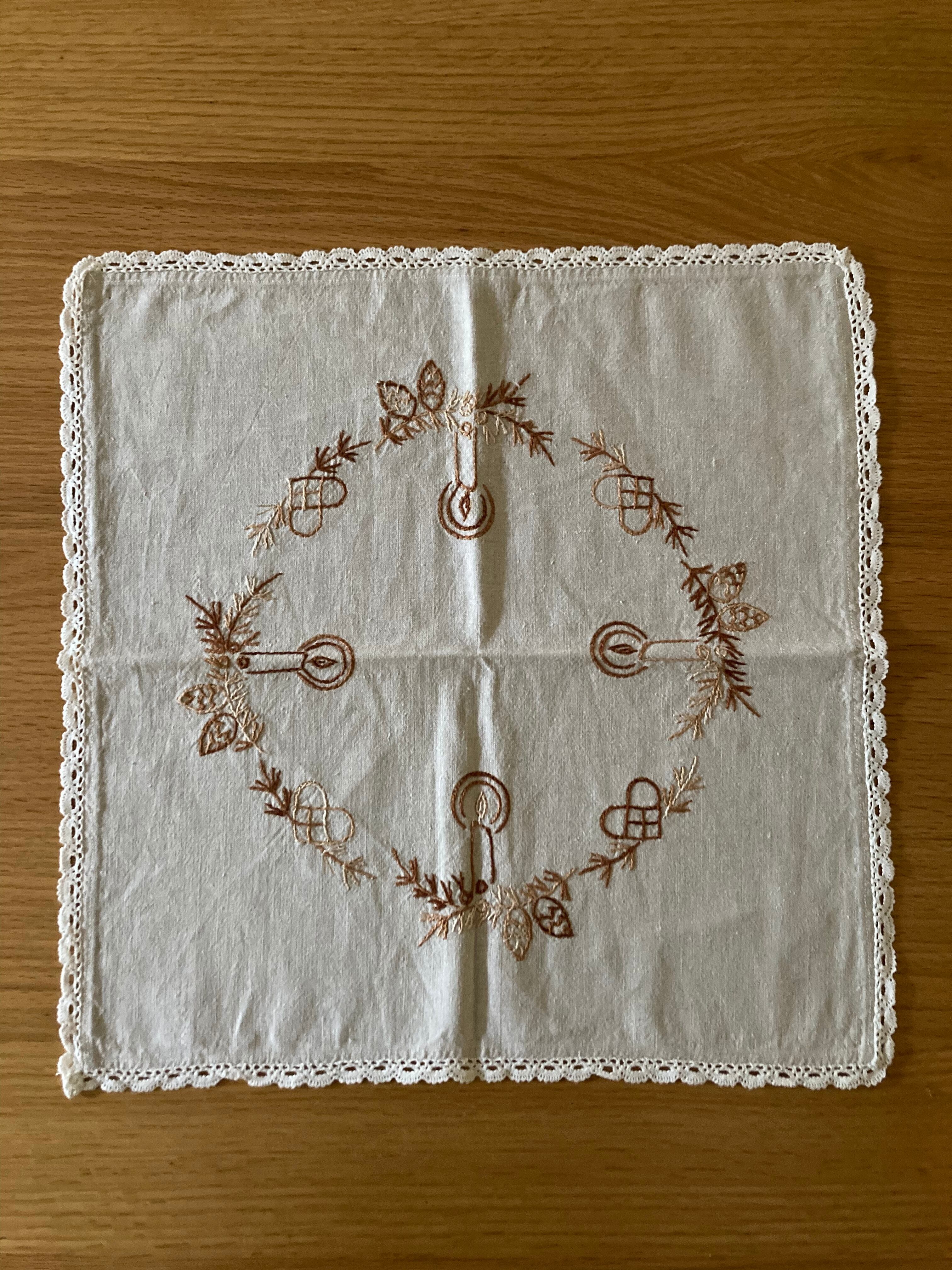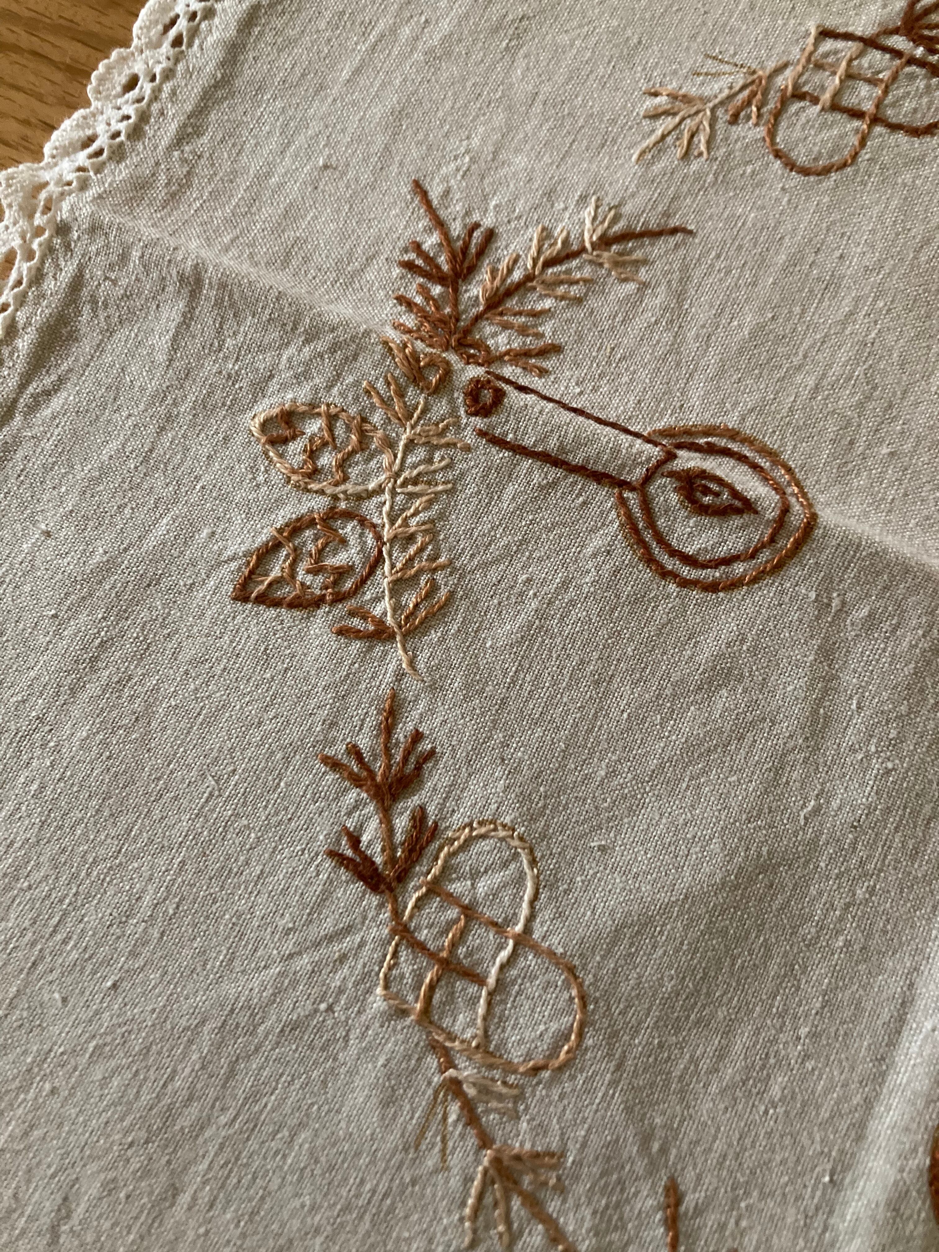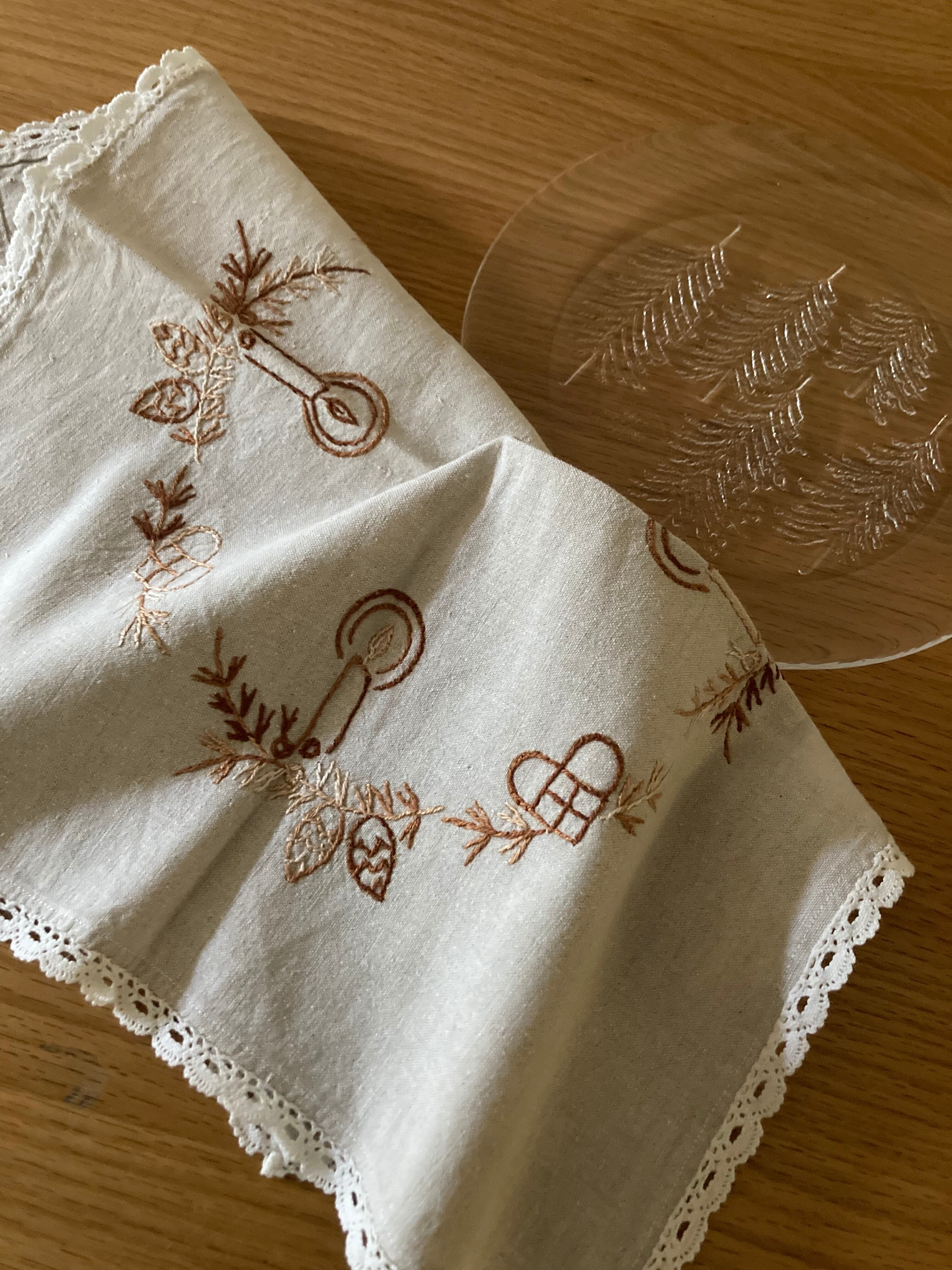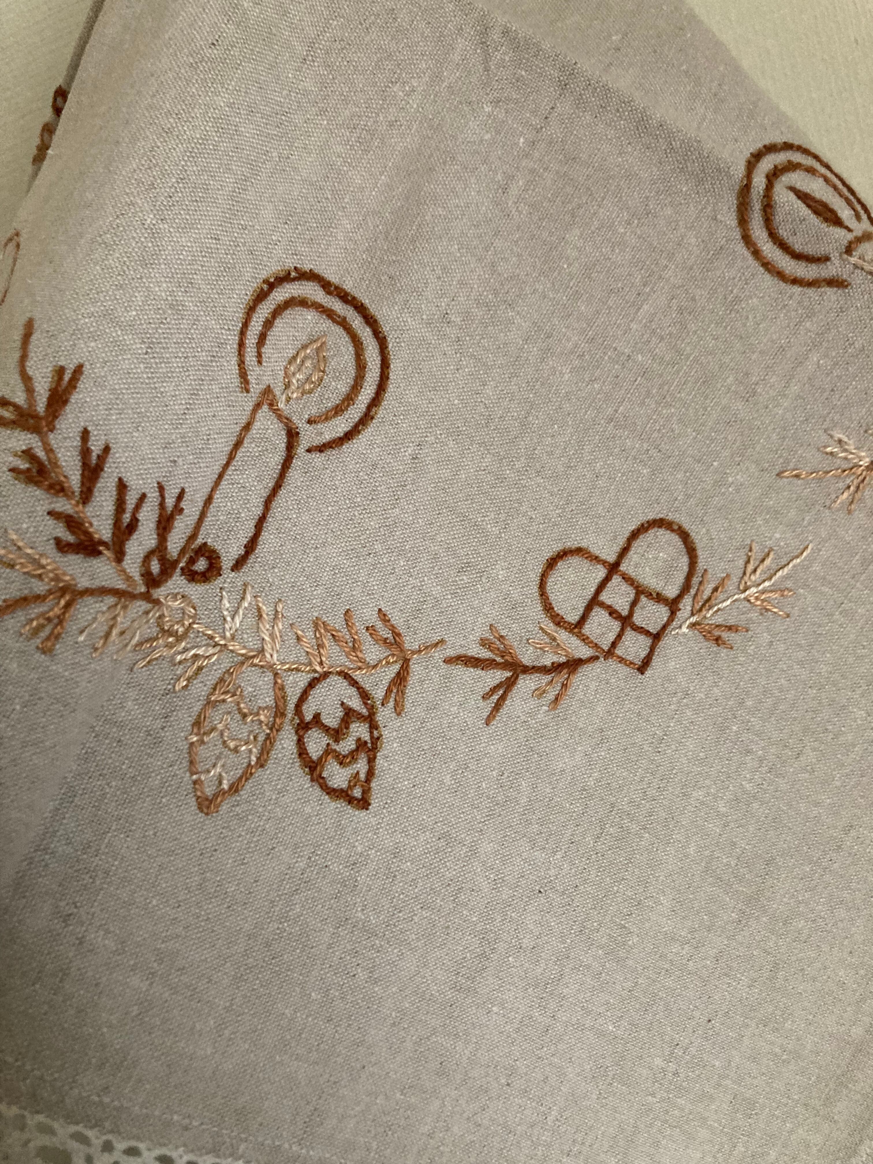 生成りのリネン生地に、キャンドルとヒイラギ、松ぼっくりのブラウン刺繍が素敵なクロスです♫