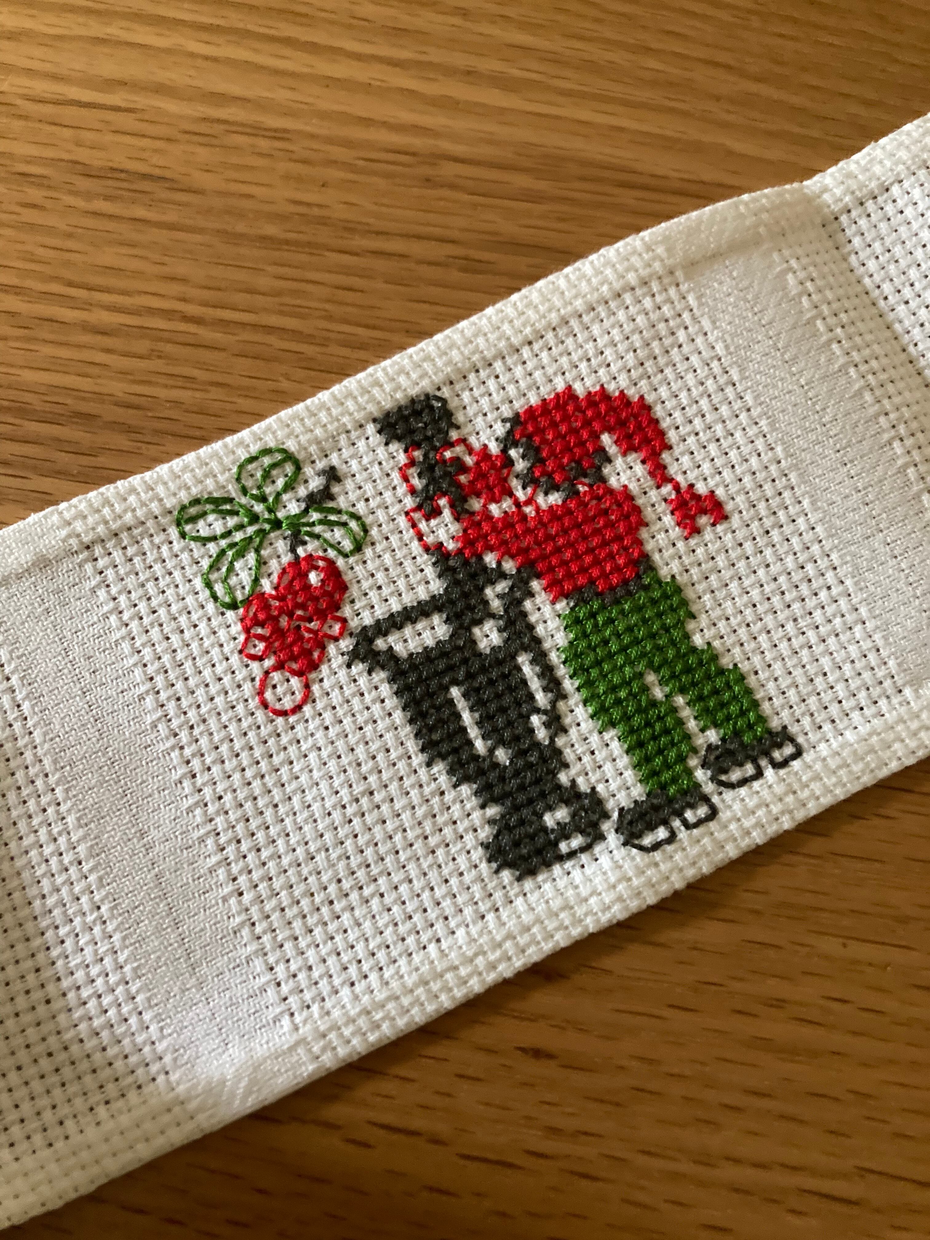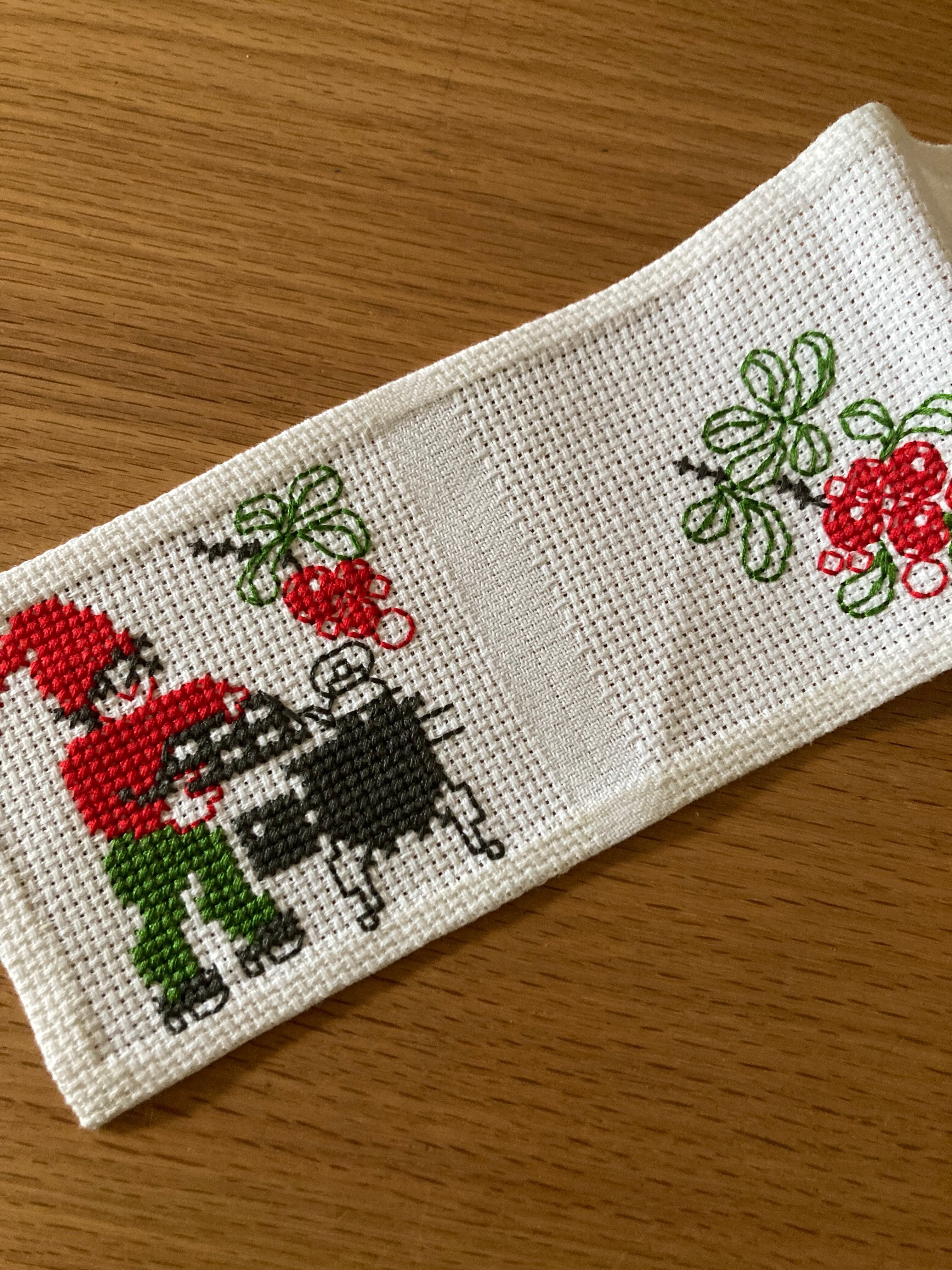 白のコットン生地に、お鍋をかき回してるトムテやネコと一緒にいるトムテの刺繍がなんとも