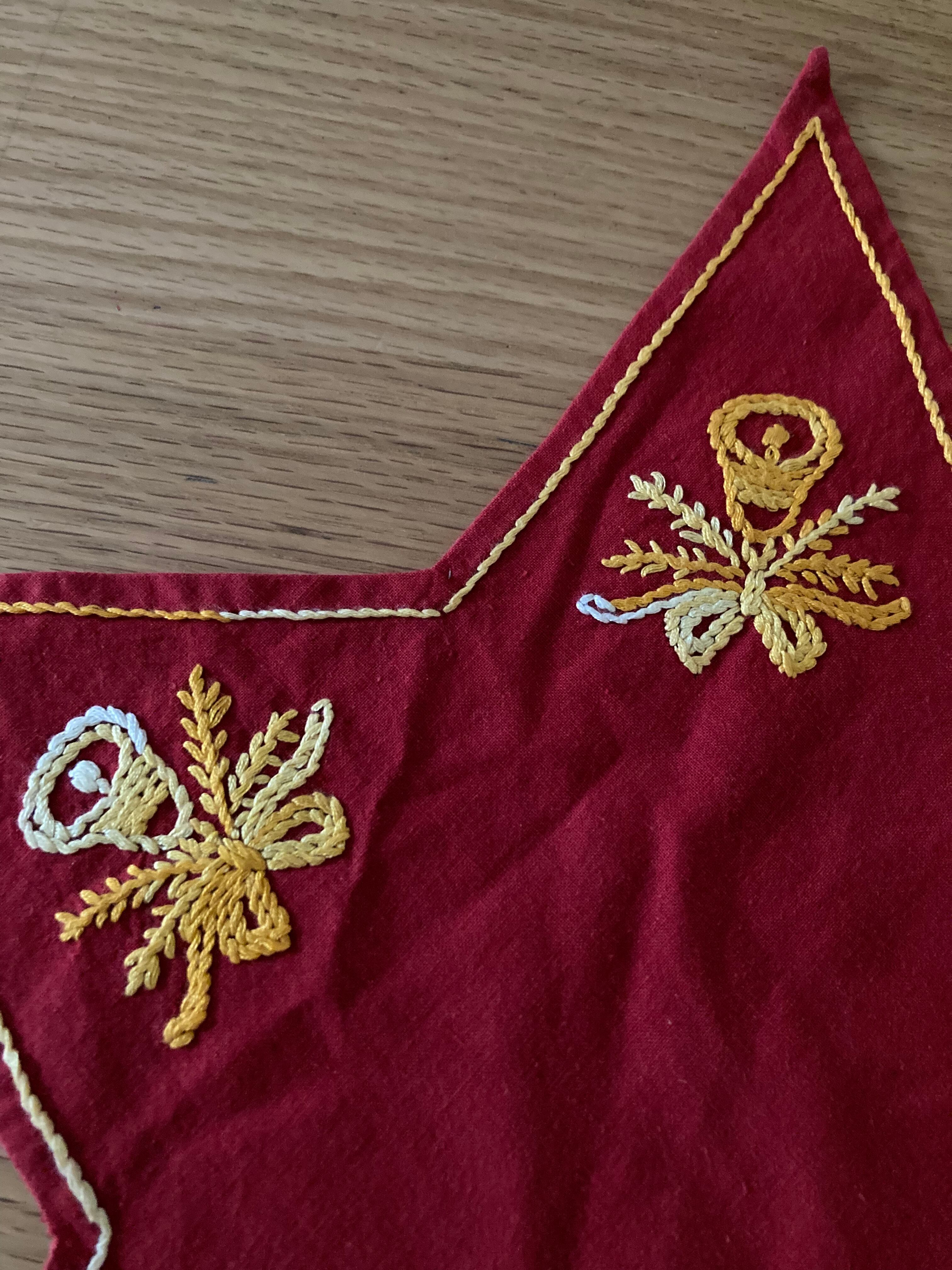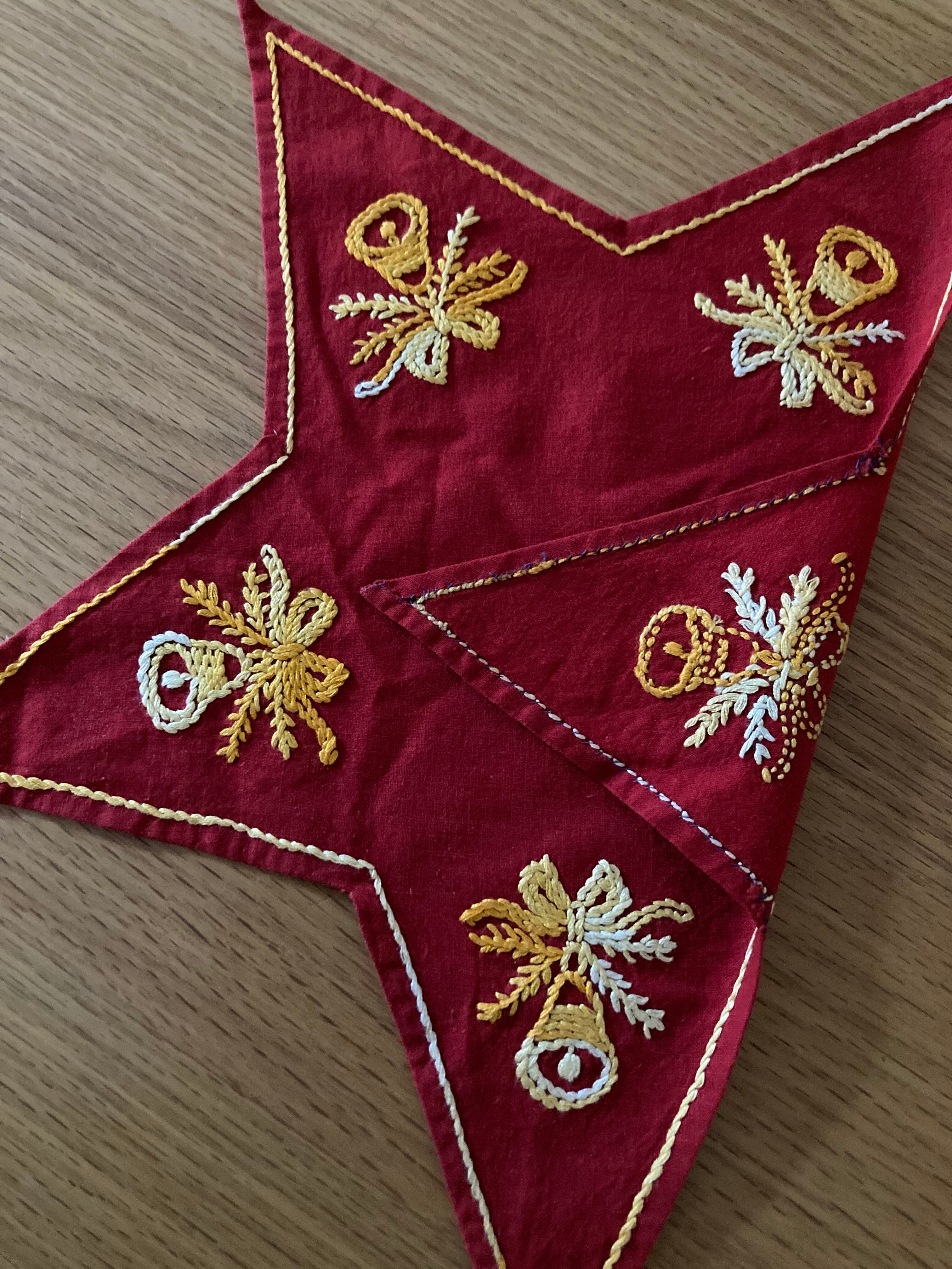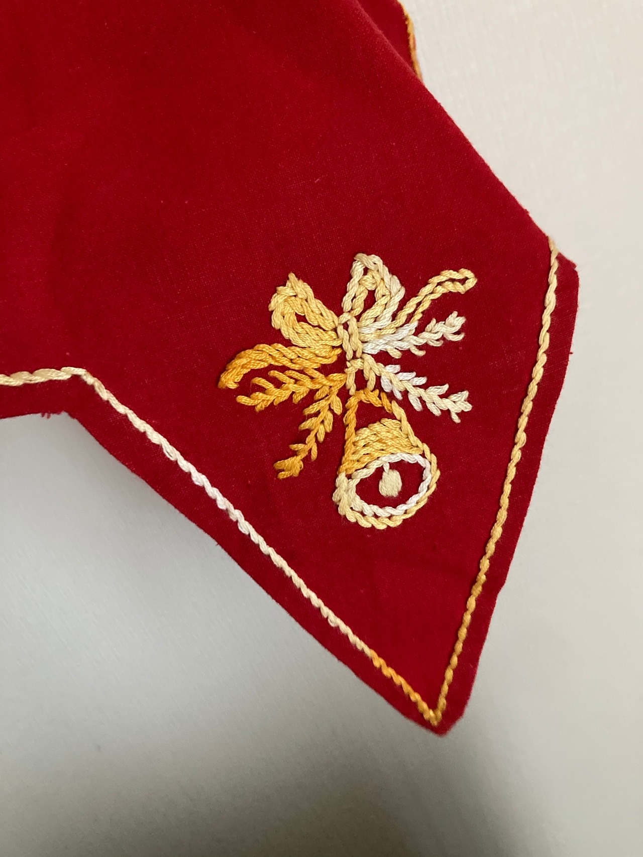 赤の薄手のコットン生地に、リボンが付いたベルの刺繍が、可愛らしい、星型のクロス♫