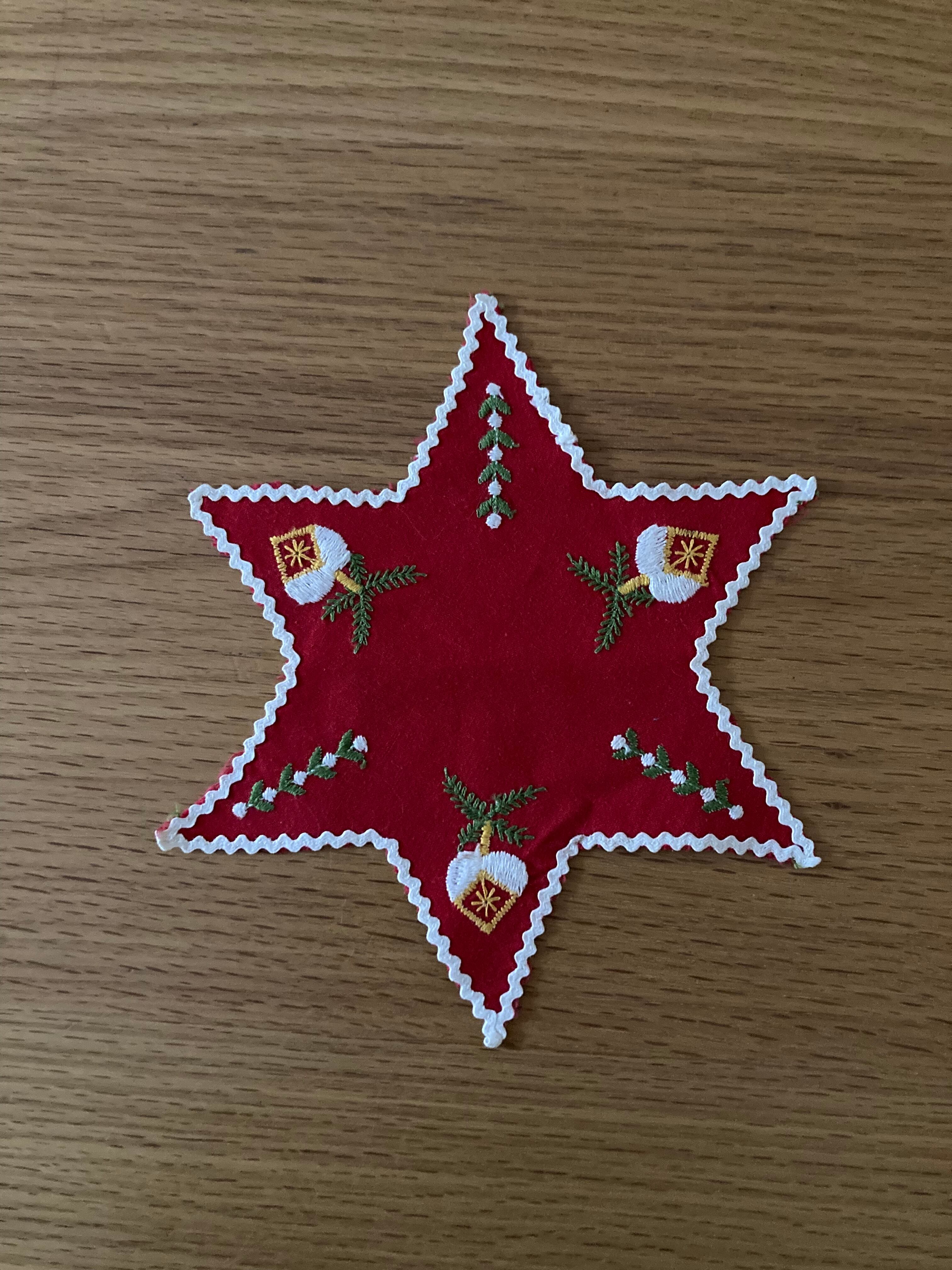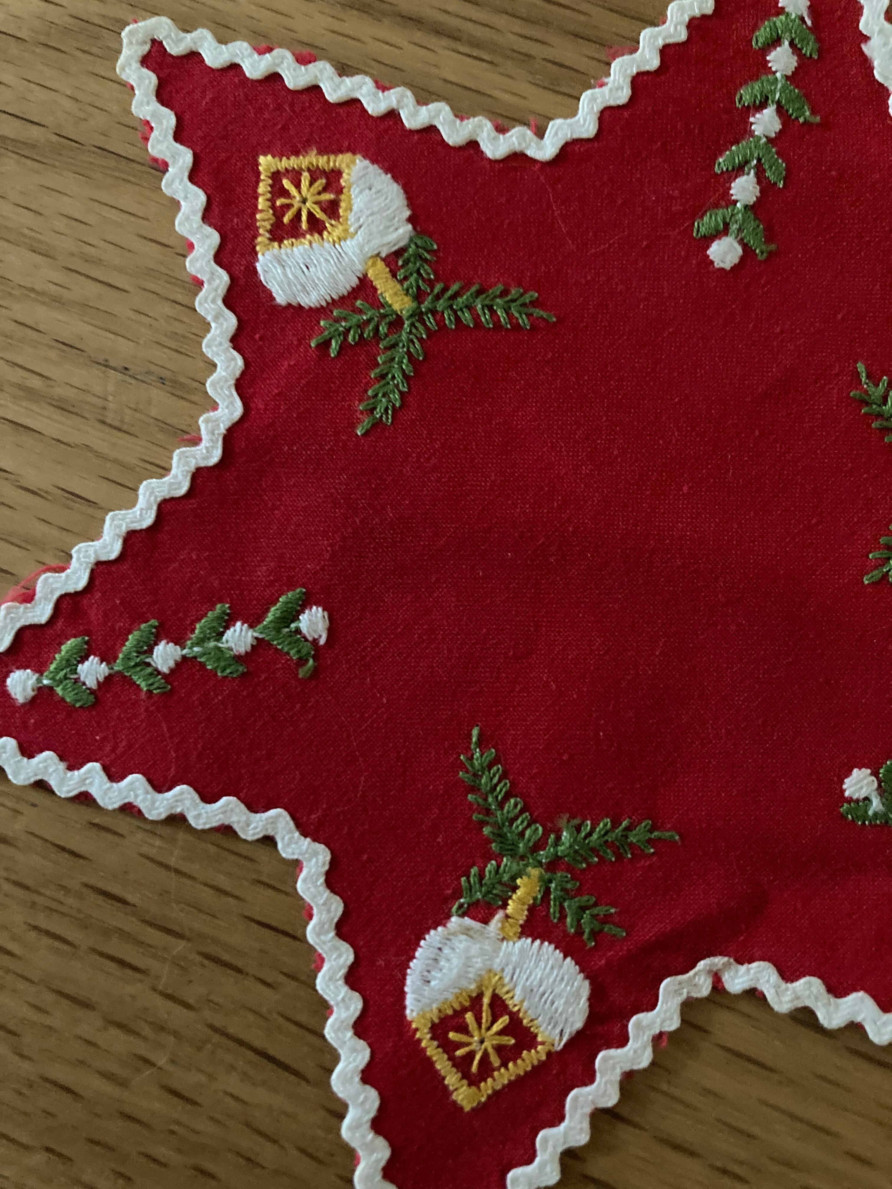 赤の薄手のコットン生地に、モミの葉が付いたハートのオーナメント刺繍が、可愛らしい、星型のクロス♫