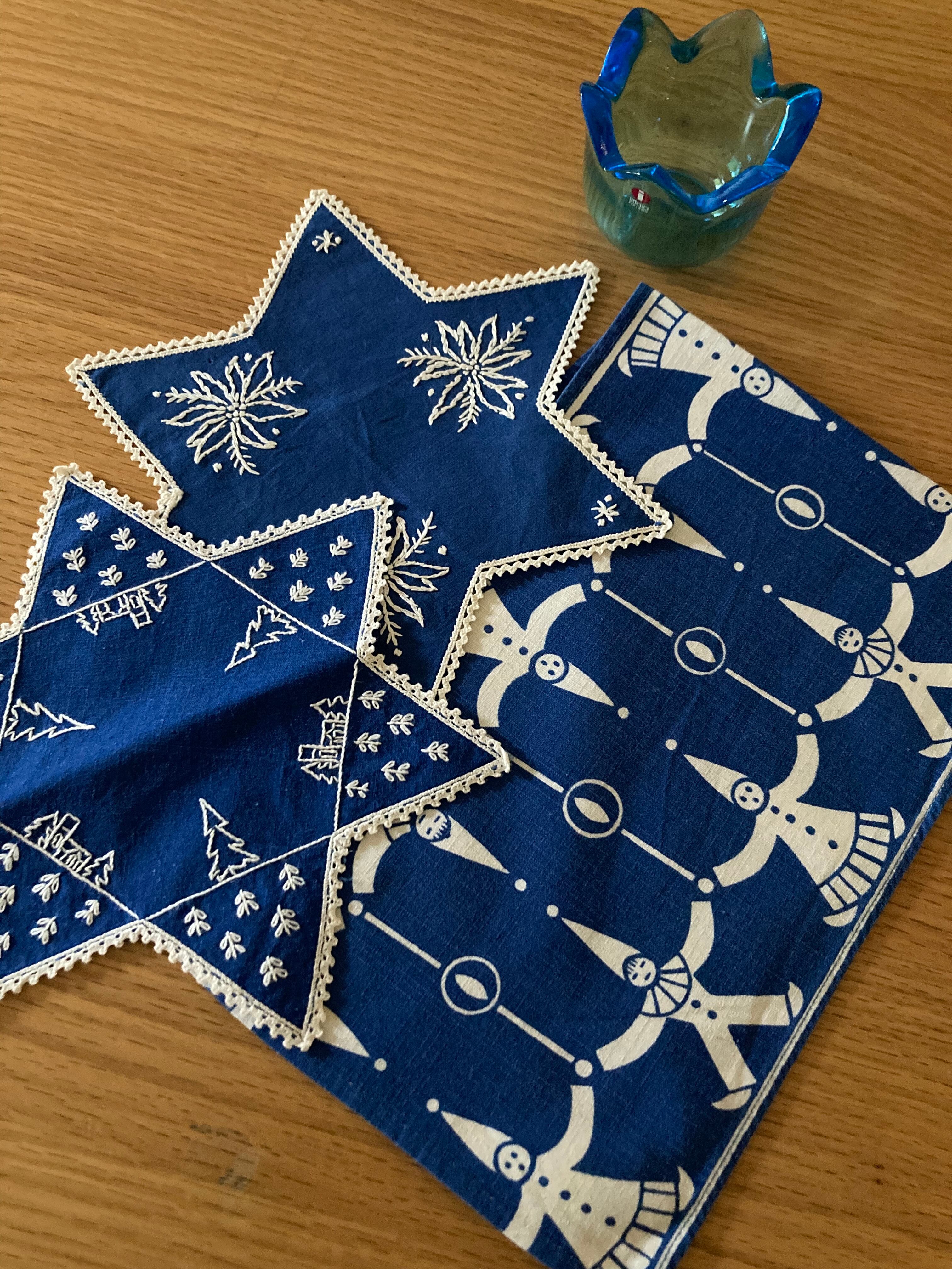 ブルー薄手のコットン生地に、ポインセチアの白い刺繍が、可愛らしい、星型のクロス♫