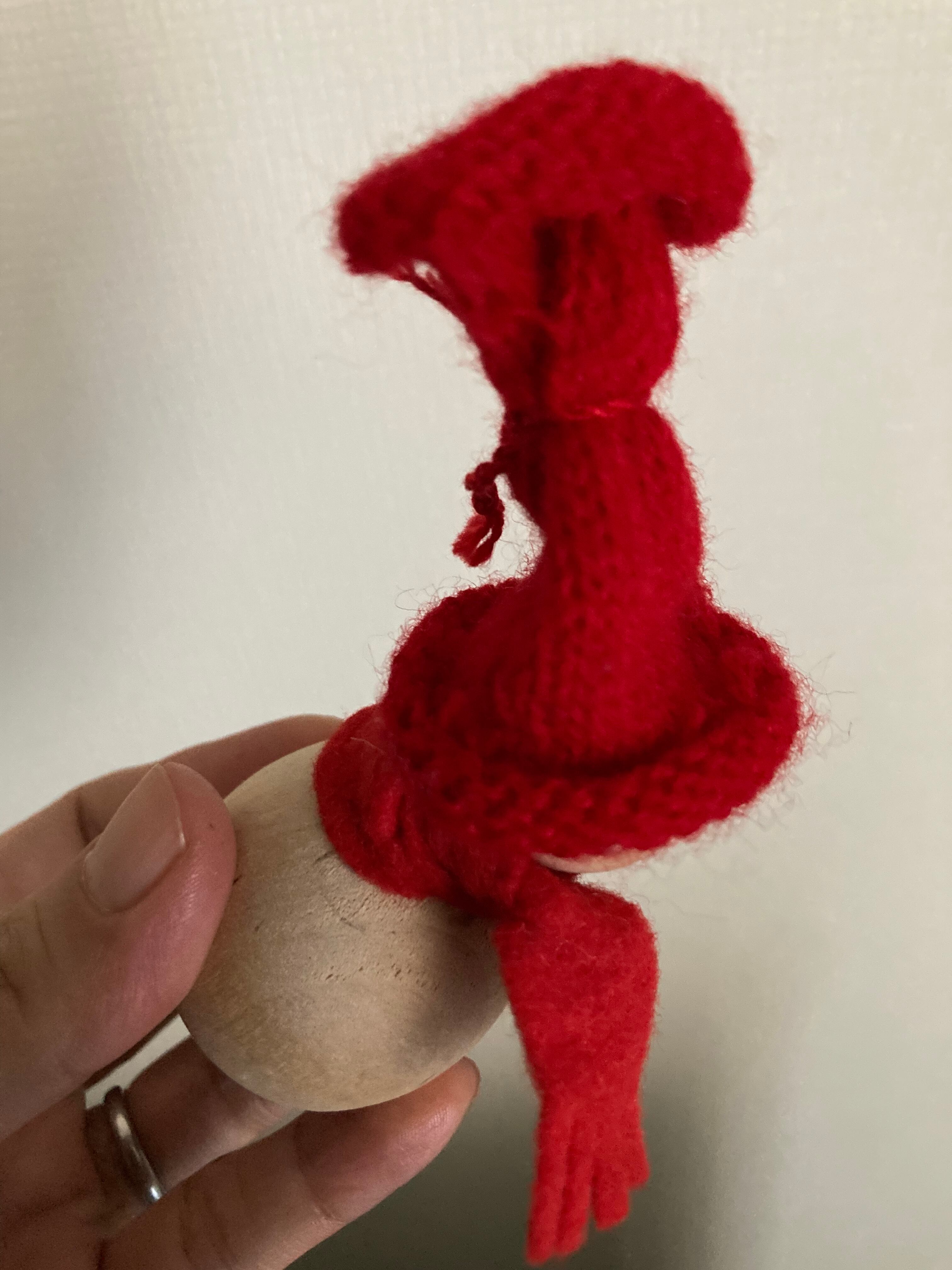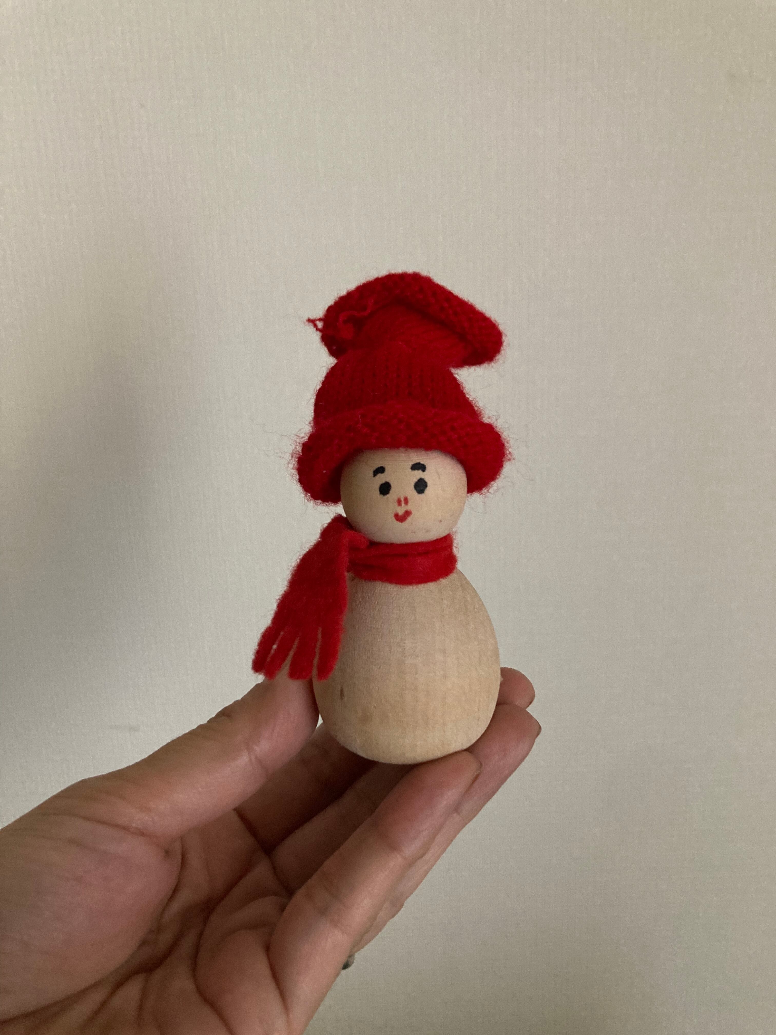 赤いニット帽とマフラーが可愛らしい、木製の雪だるま♫
