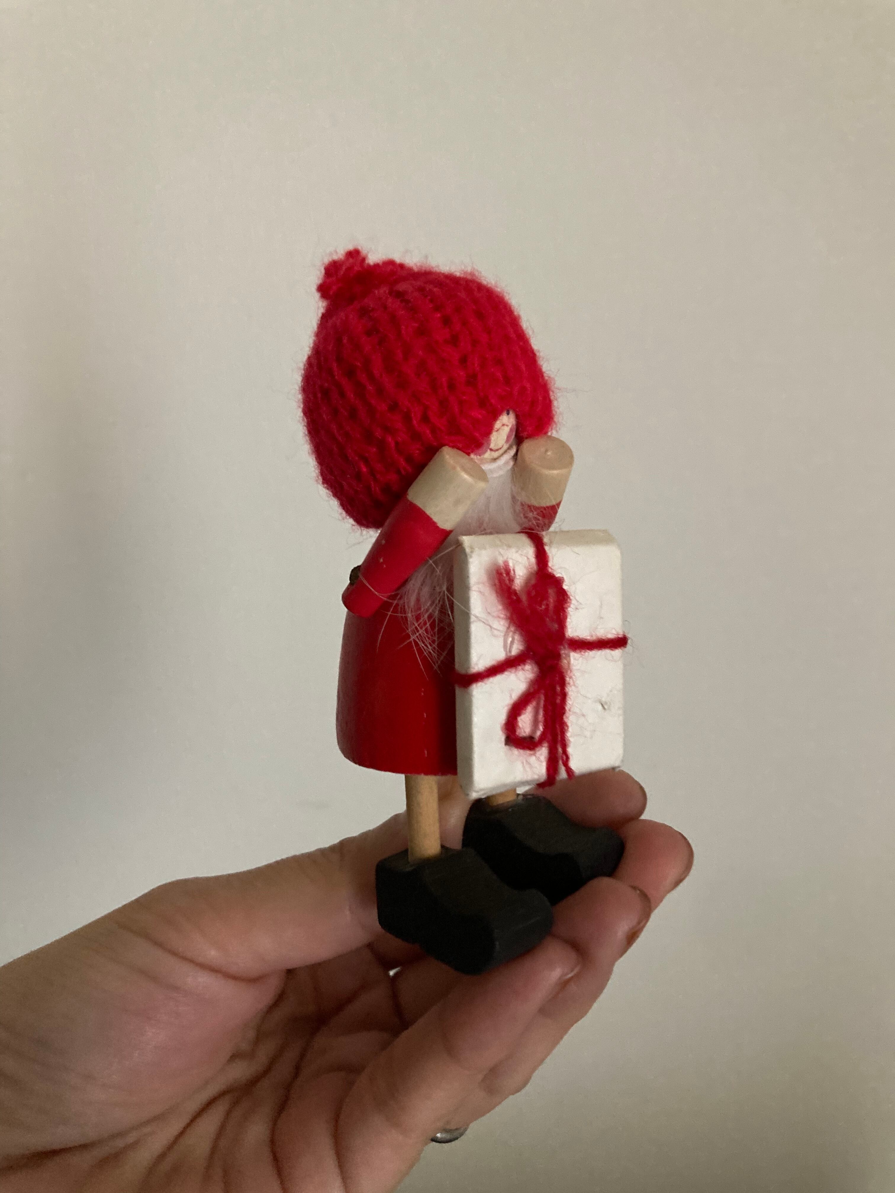 赤のニット帽とプレゼントを持った姿がなんとも愛らしくて、可愛いらしい木製のトムテになります。