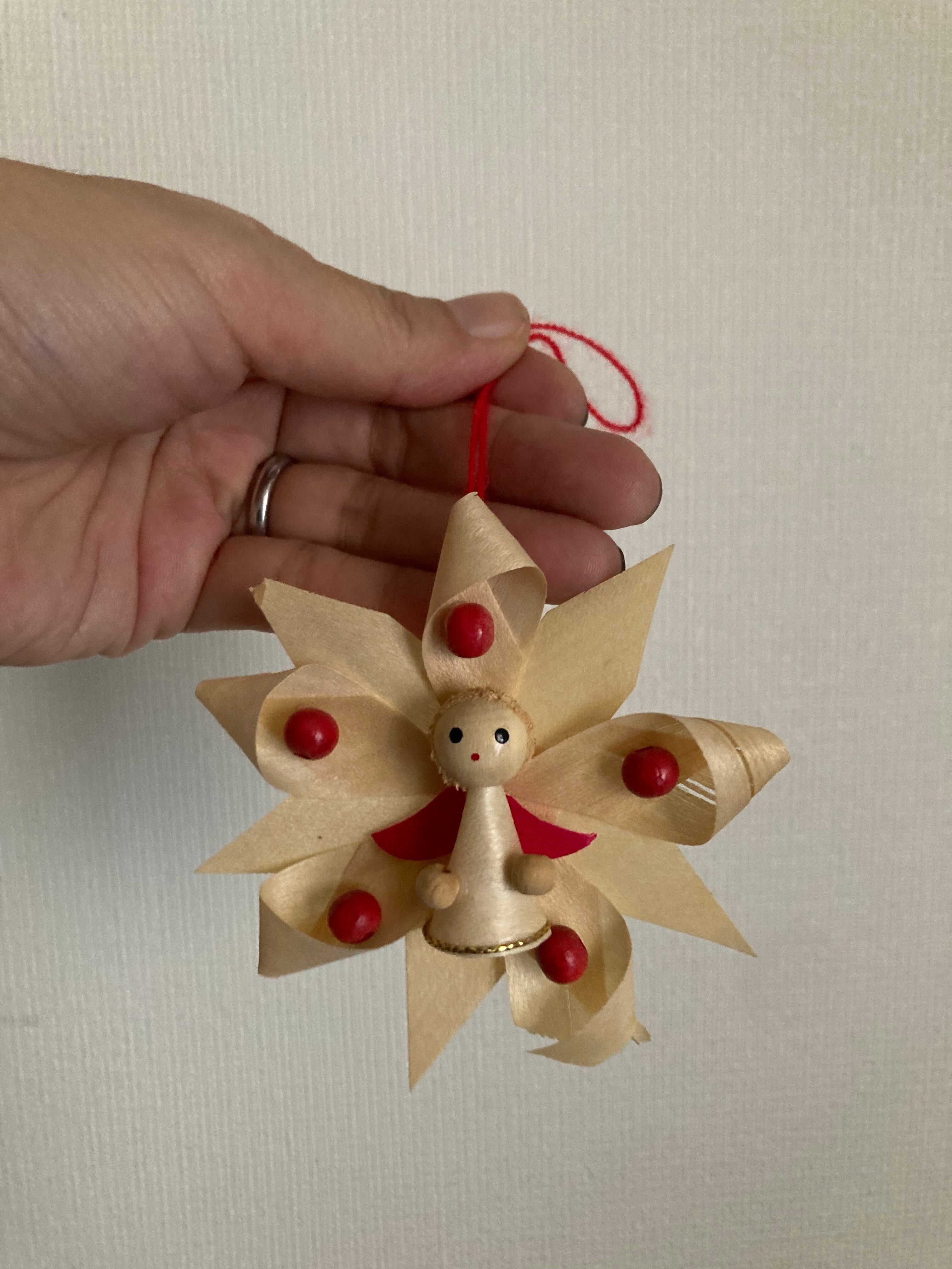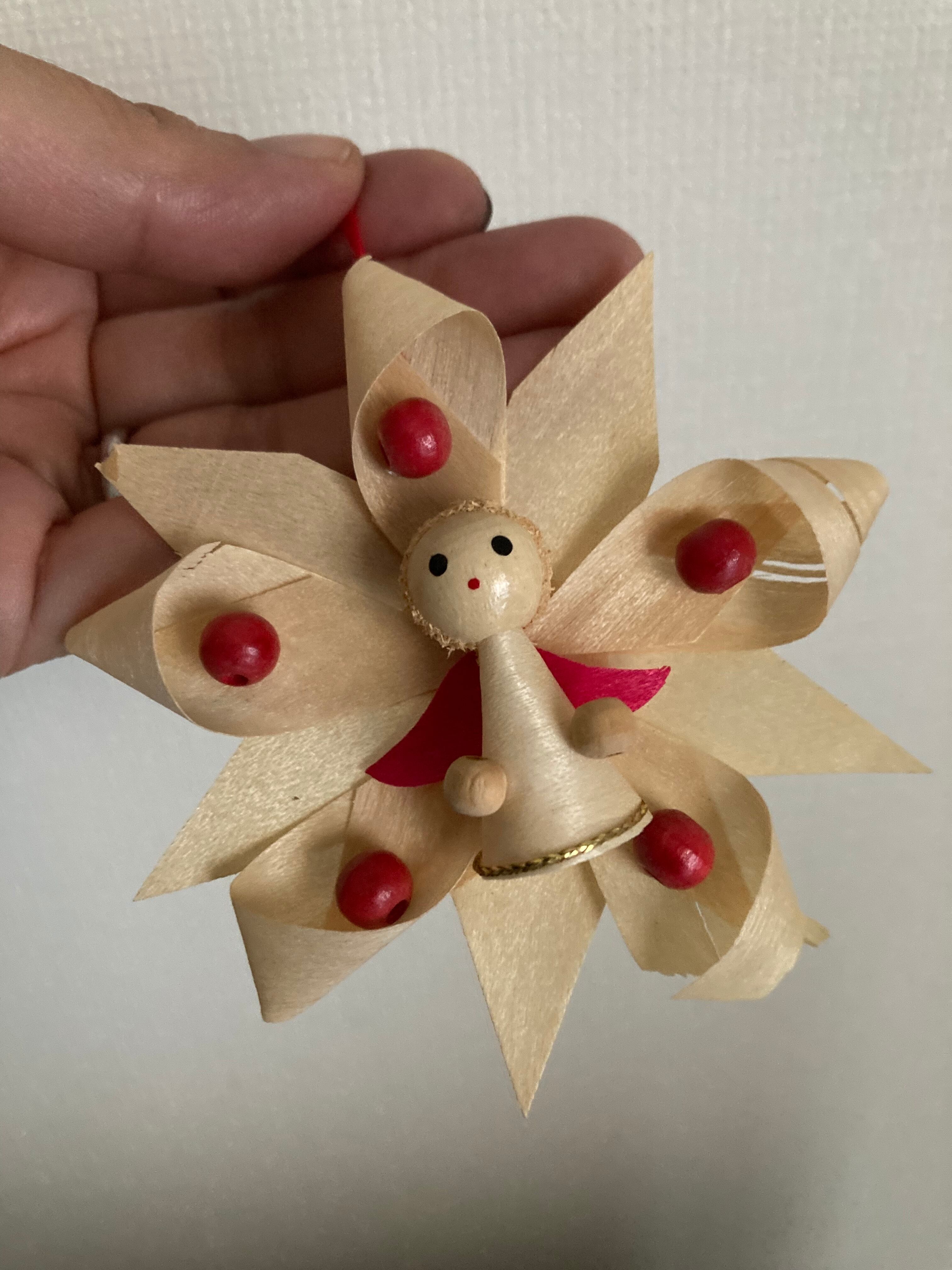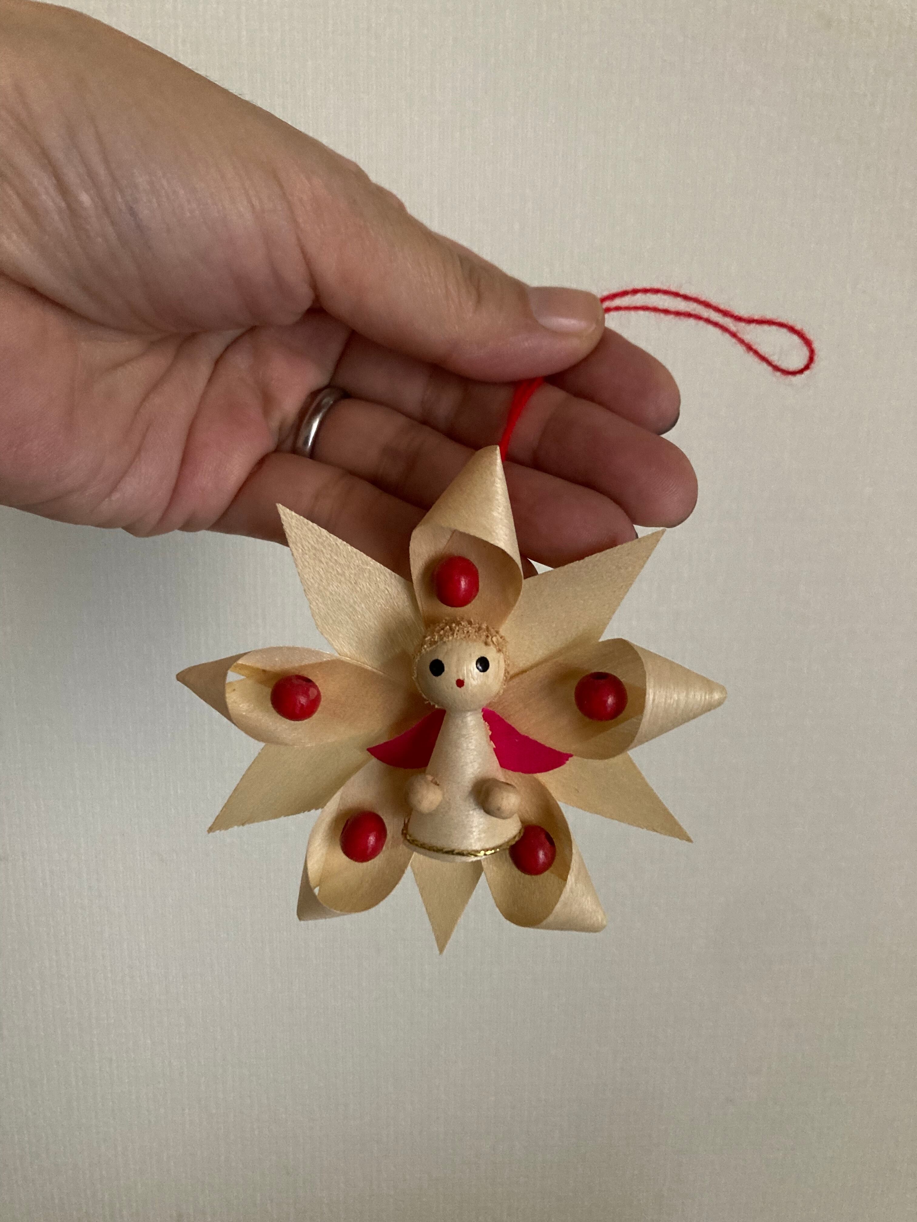 木の樹皮を薄くスライスして作られたオーナメントはスウェーデンの伝統的なクリスマス飾りになります。こちらは天使とウッドビーズがとても