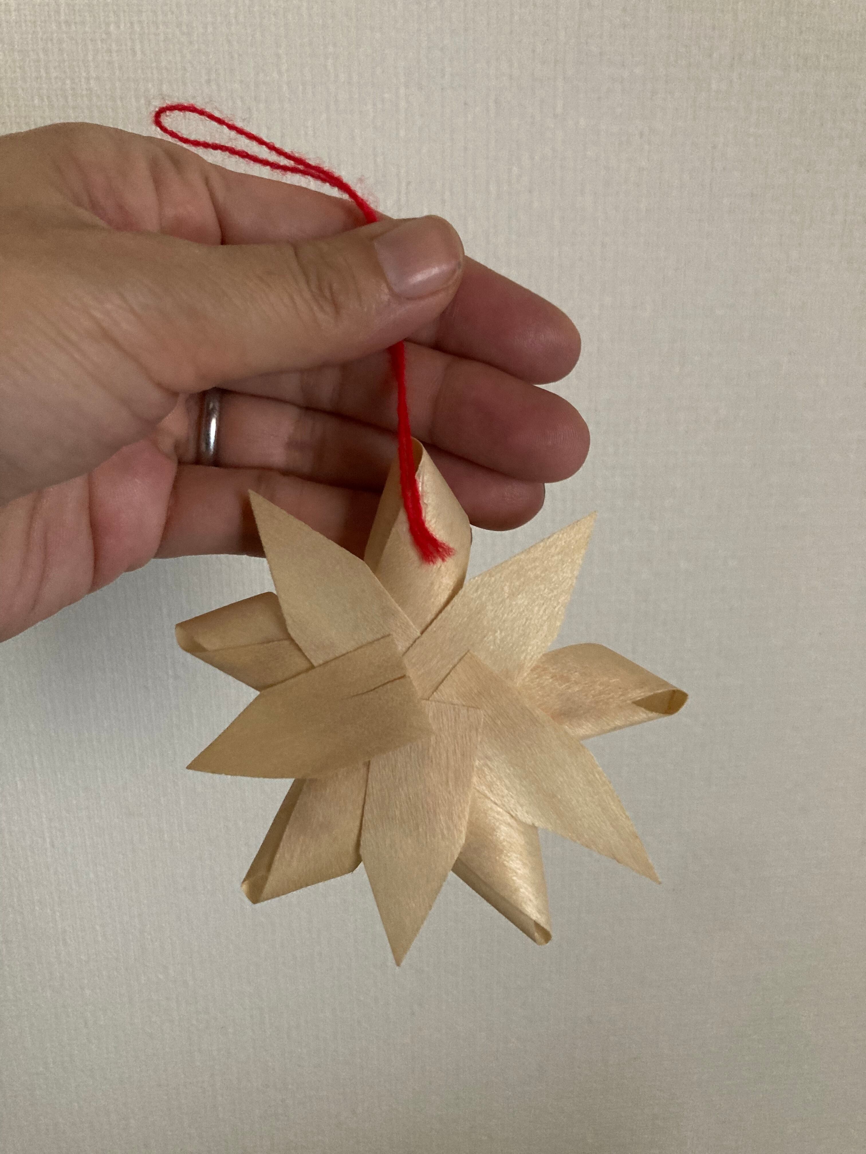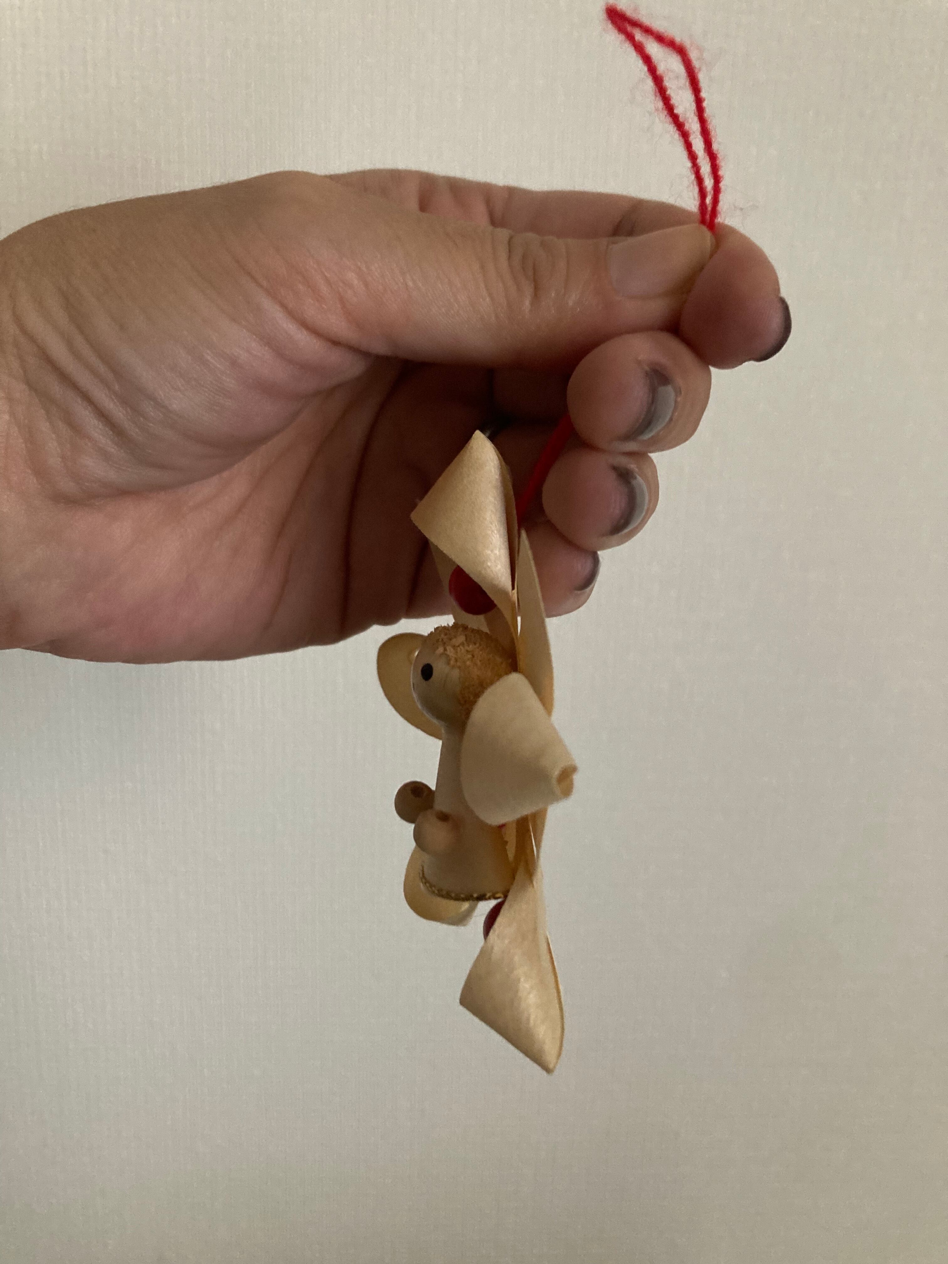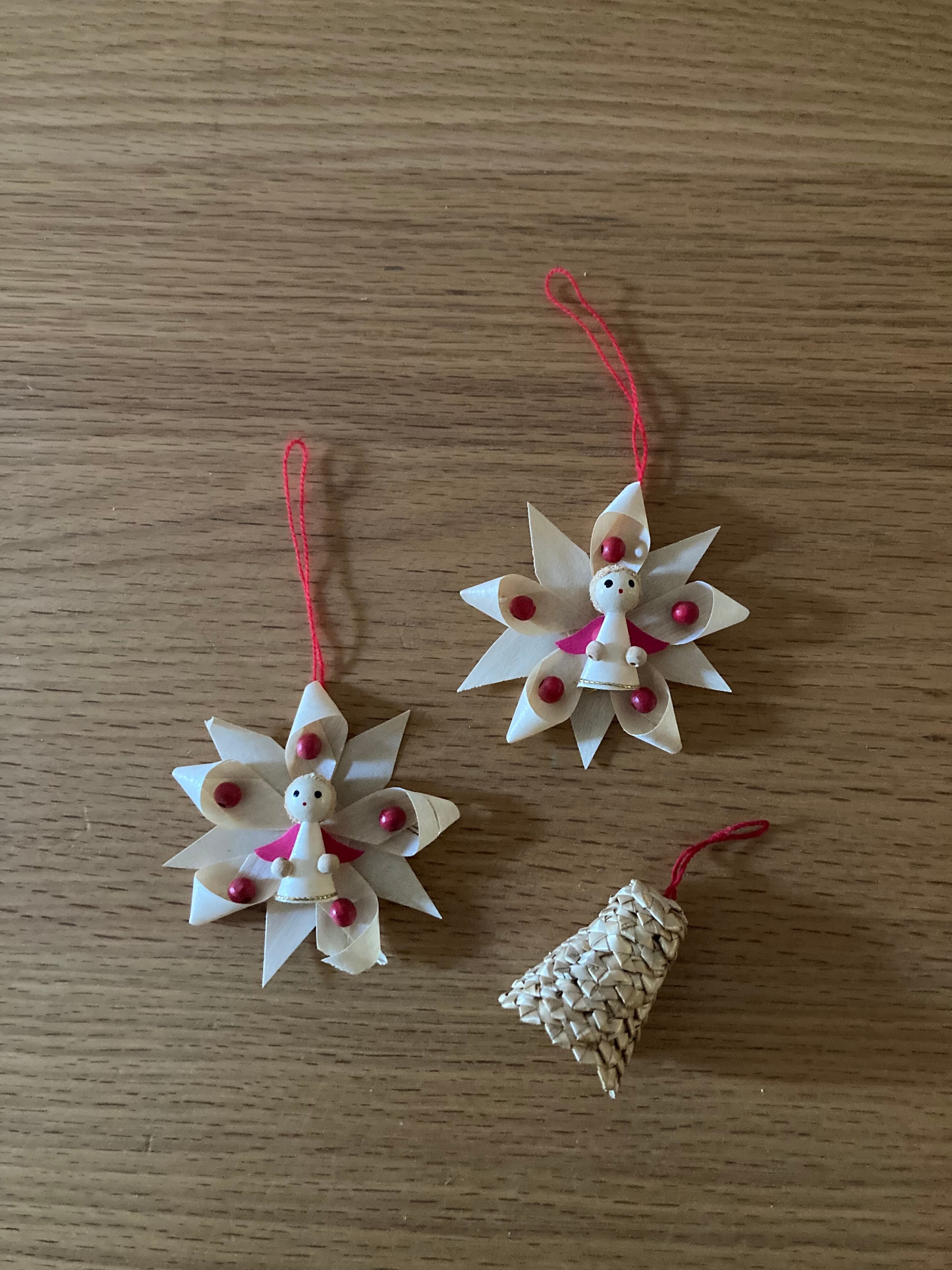 木の樹皮を薄くスライスして作られたオーナメントはスウェーデンの伝統的なクリスマス飾りになります。こちらは天使とウッドビーズがとても