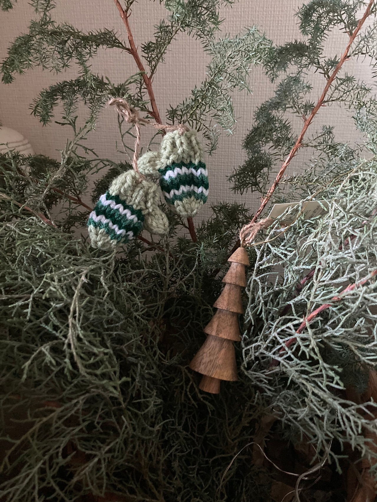 ウール100%の毛糸で編まれたミトンのオーナメント♫