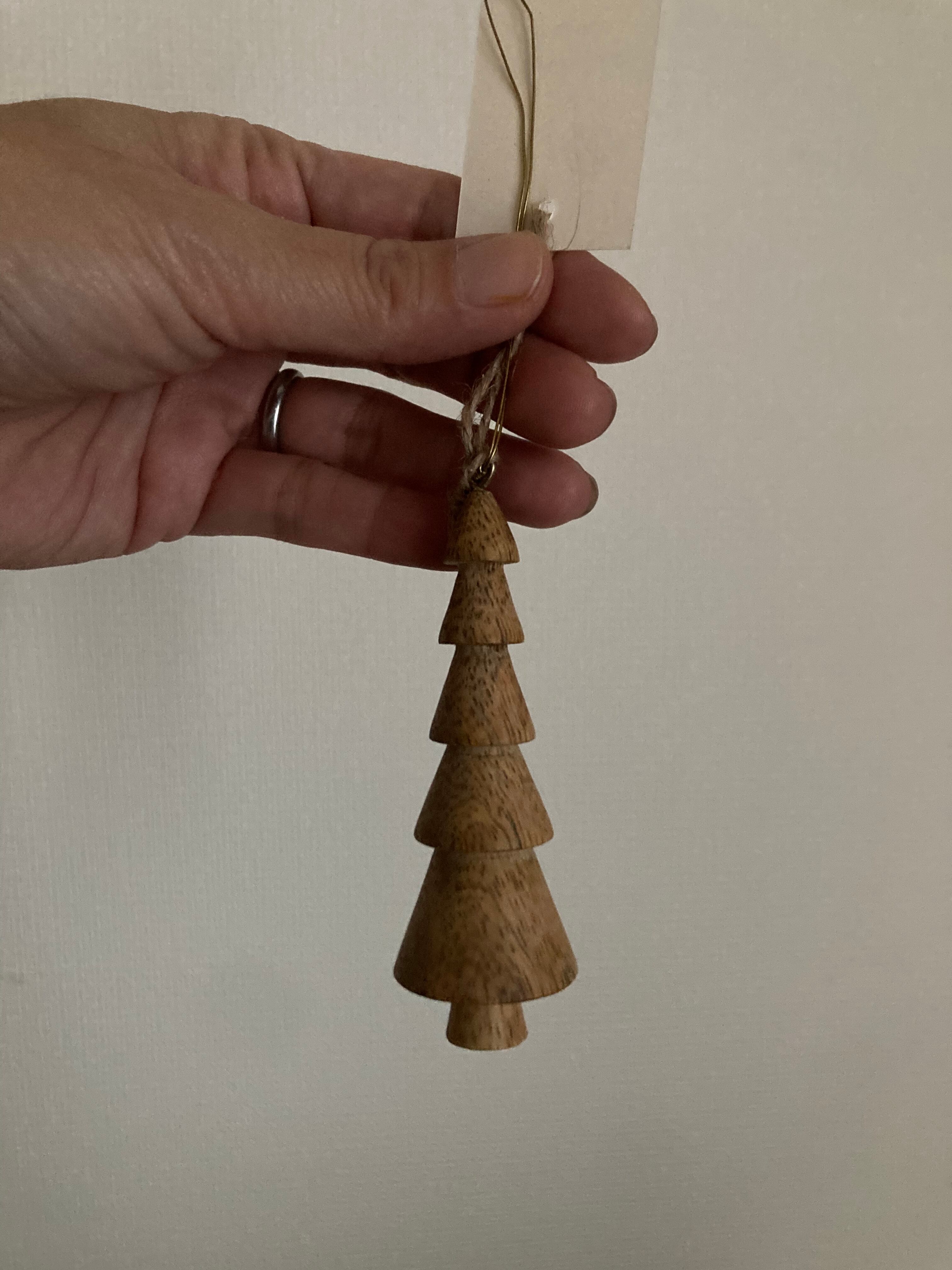 ナチュラルな木(マンゴーウッド)のツリー型のオーナメントになります。
