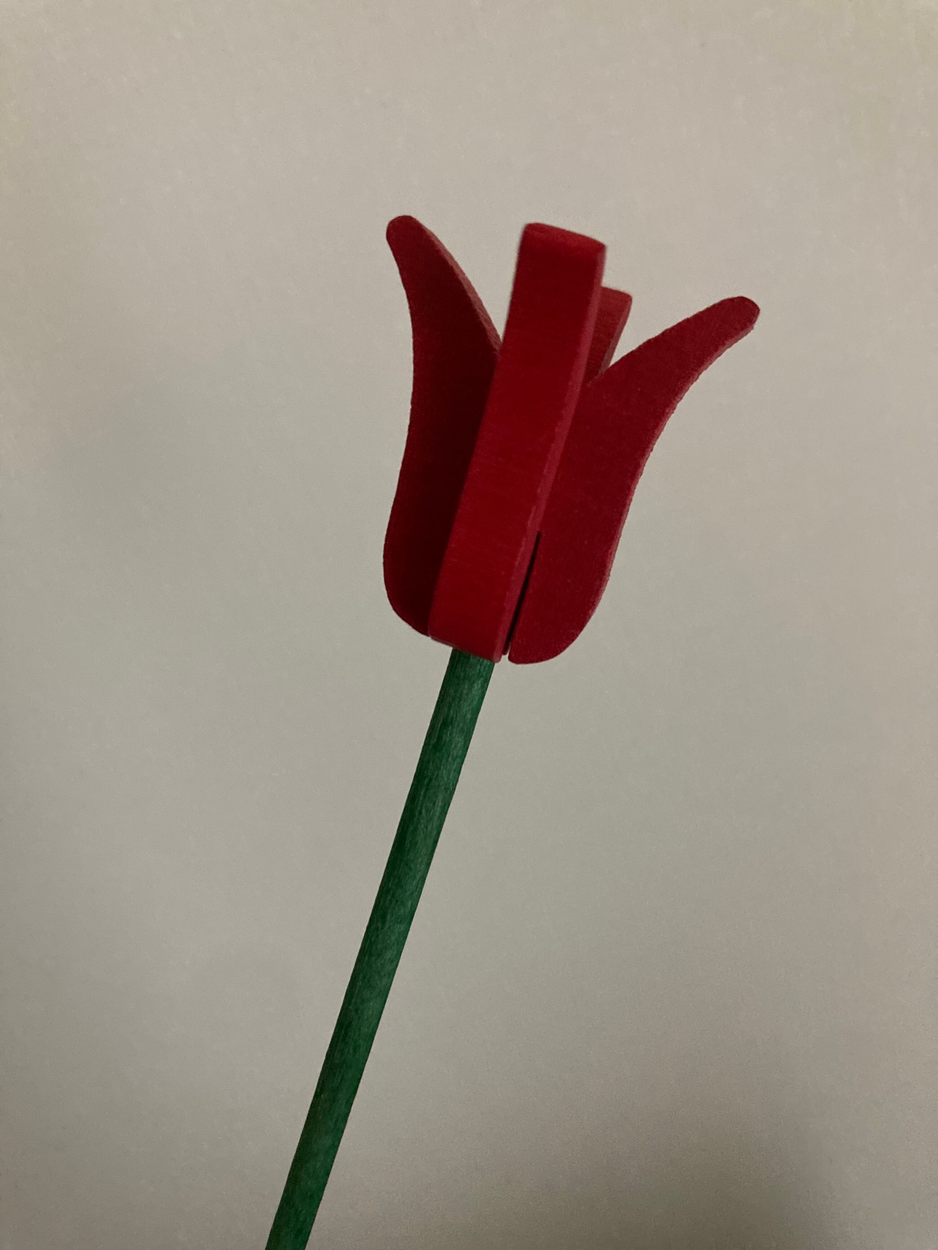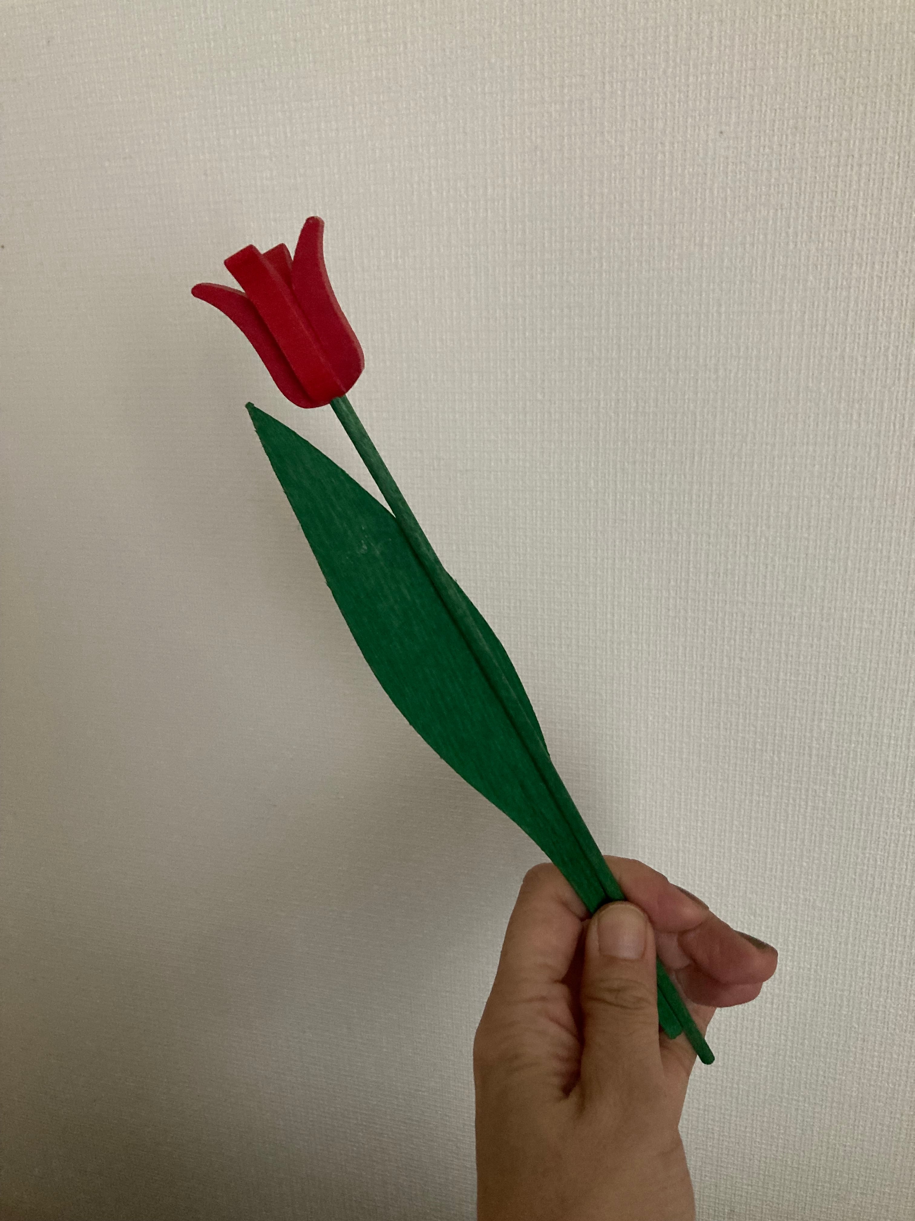 木製の葉っぱと茎のグリーンに、赤いチューリップが可愛らしいてす♫