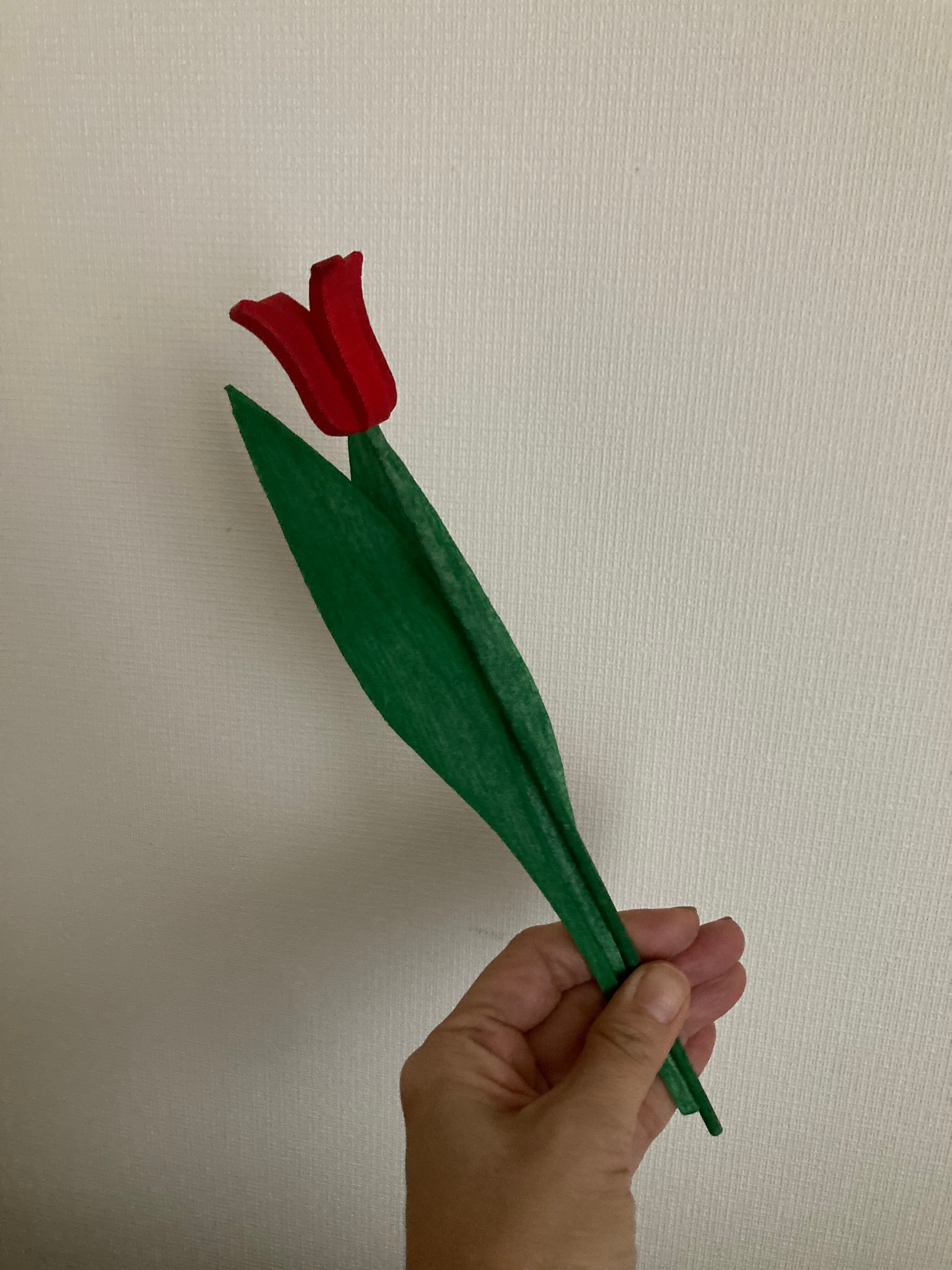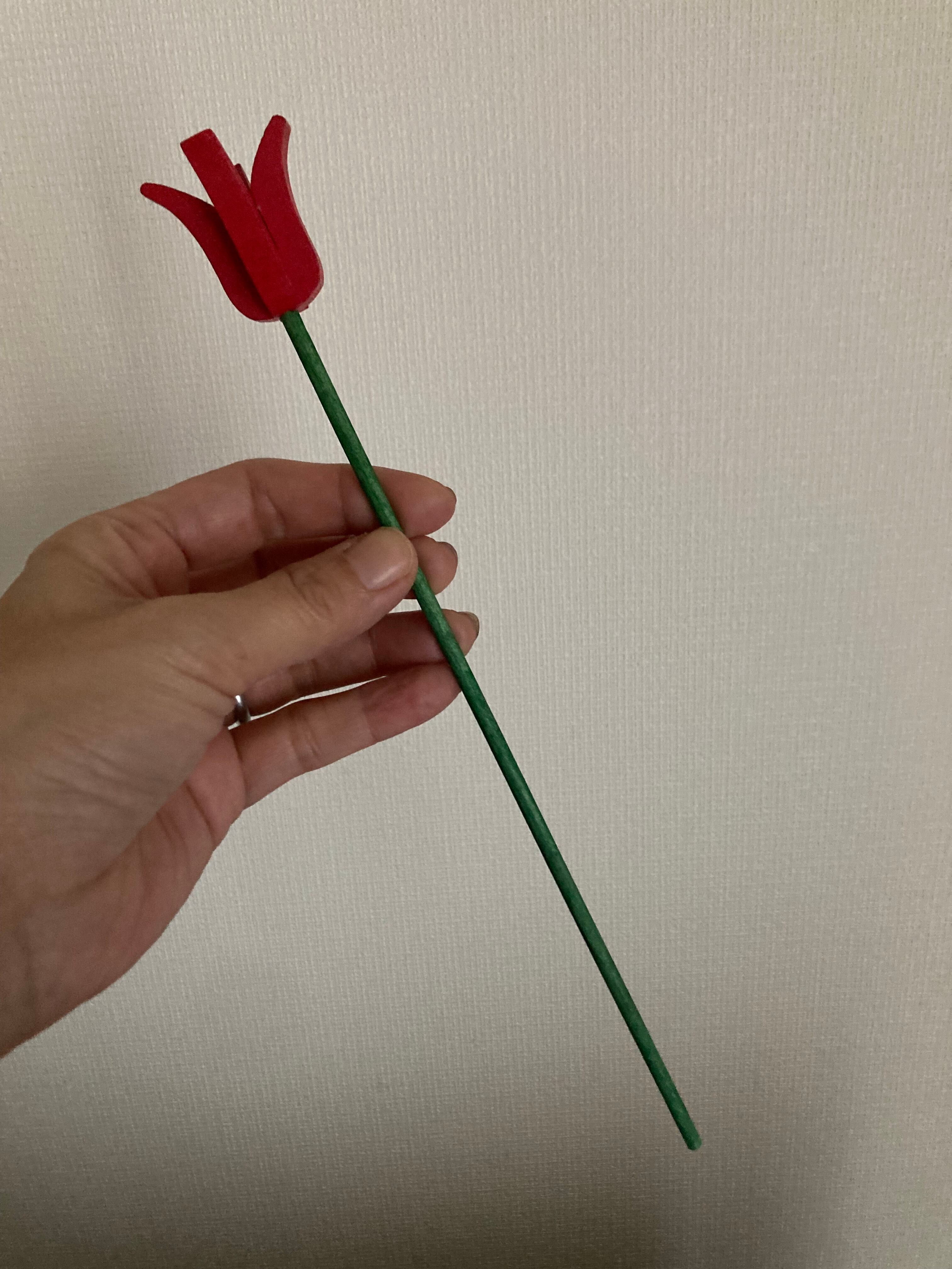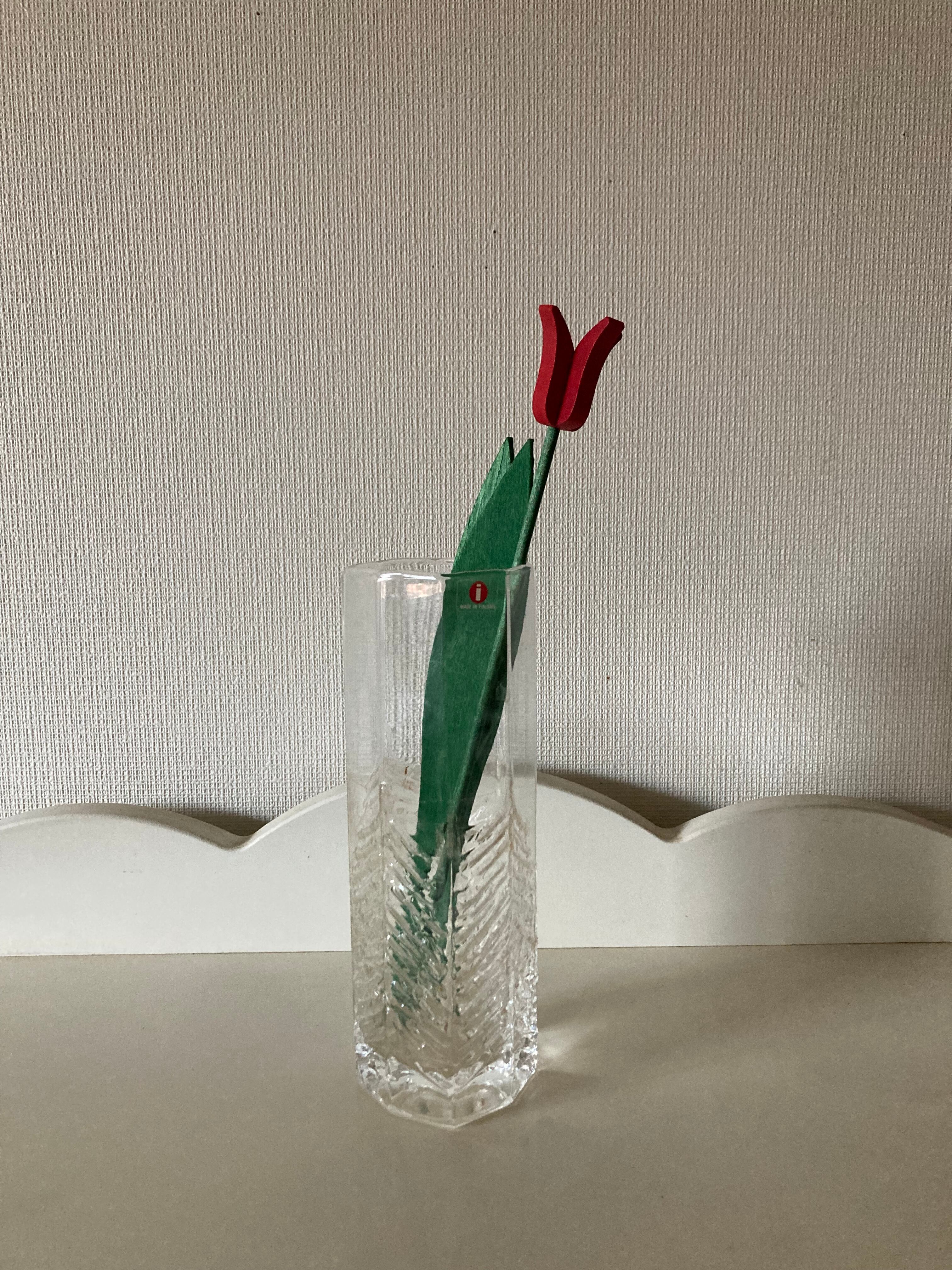 木製の葉っぱと茎のグリーンに、赤いチューリップが可愛らしいてす♫