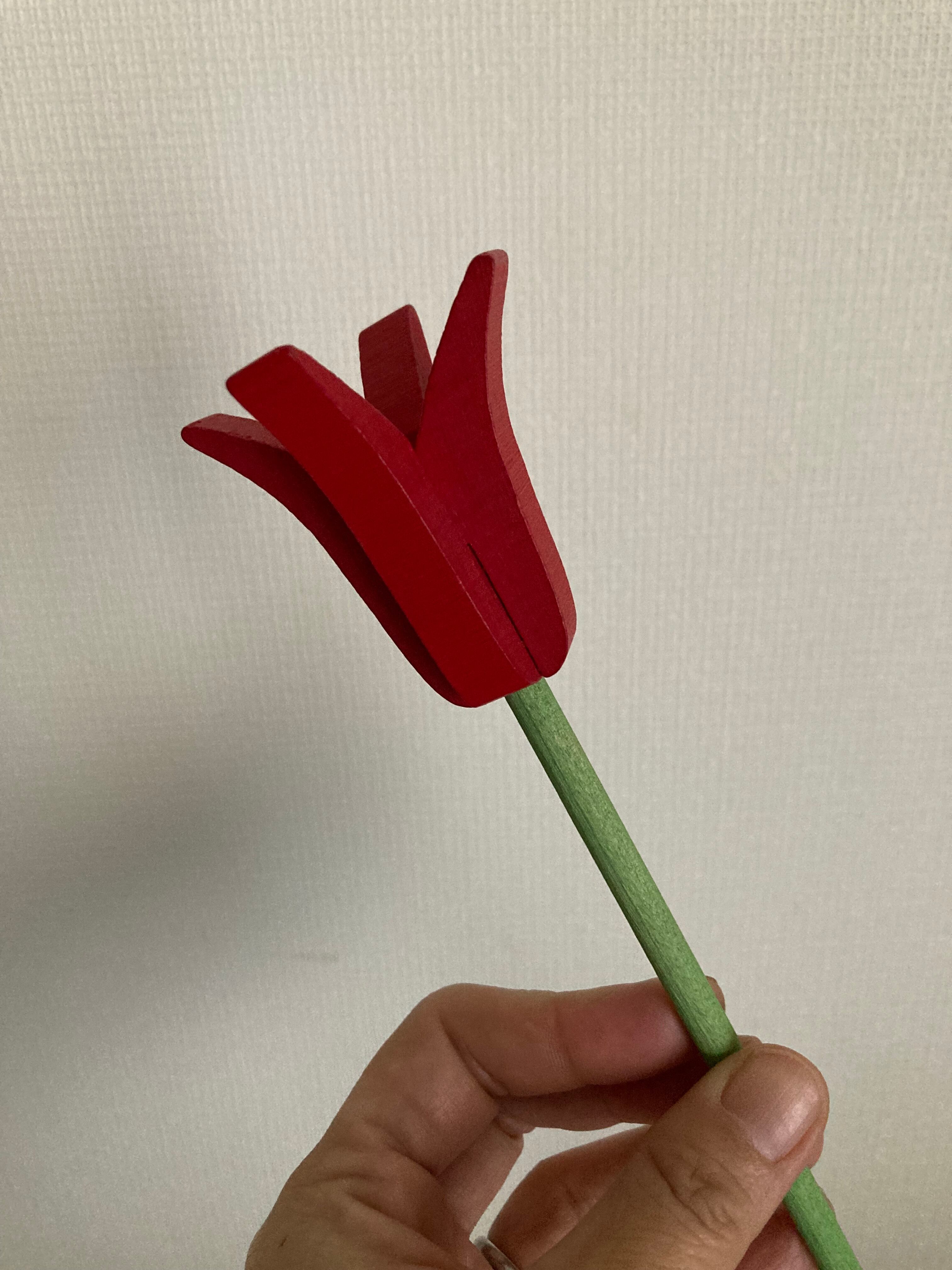 木製のすっとした茎のグリーンに、赤のチューリップが可愛らしいてす♫