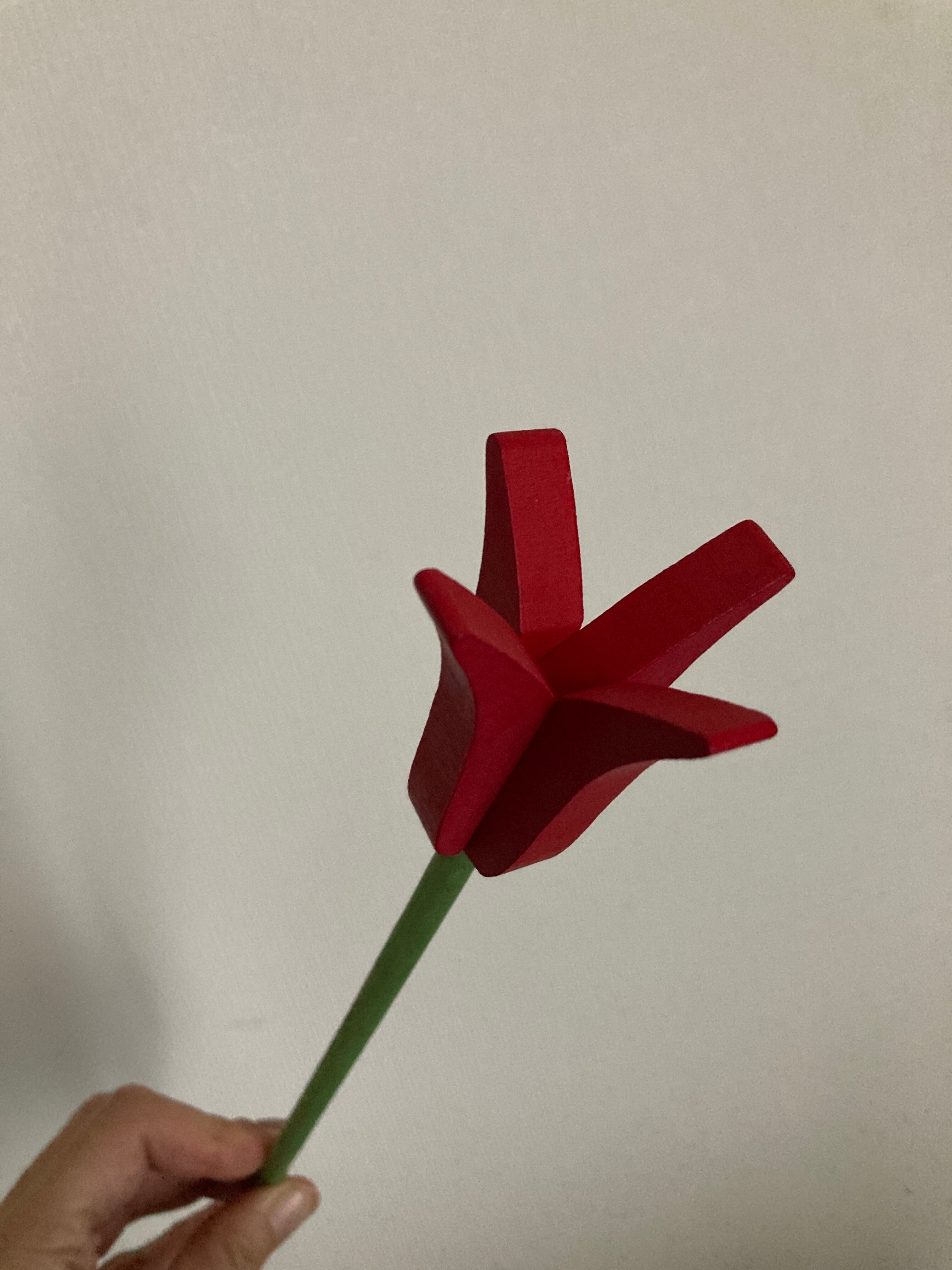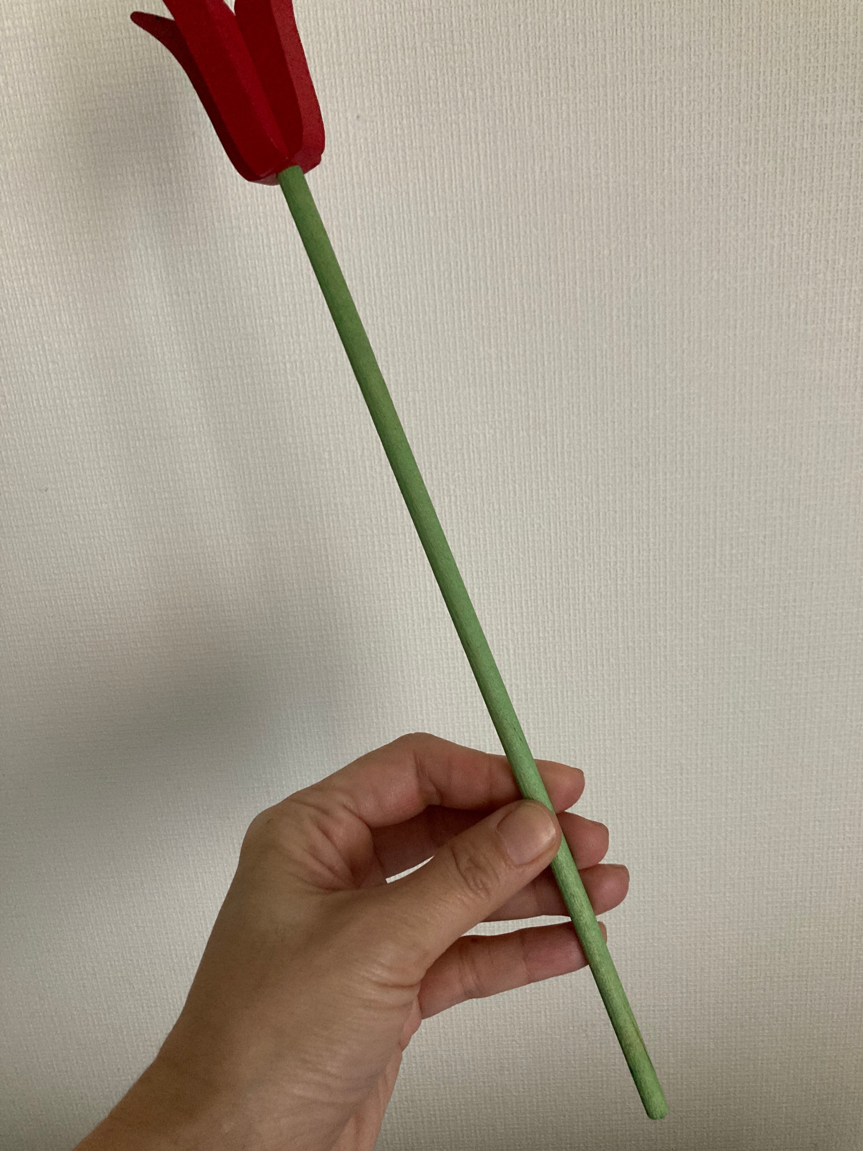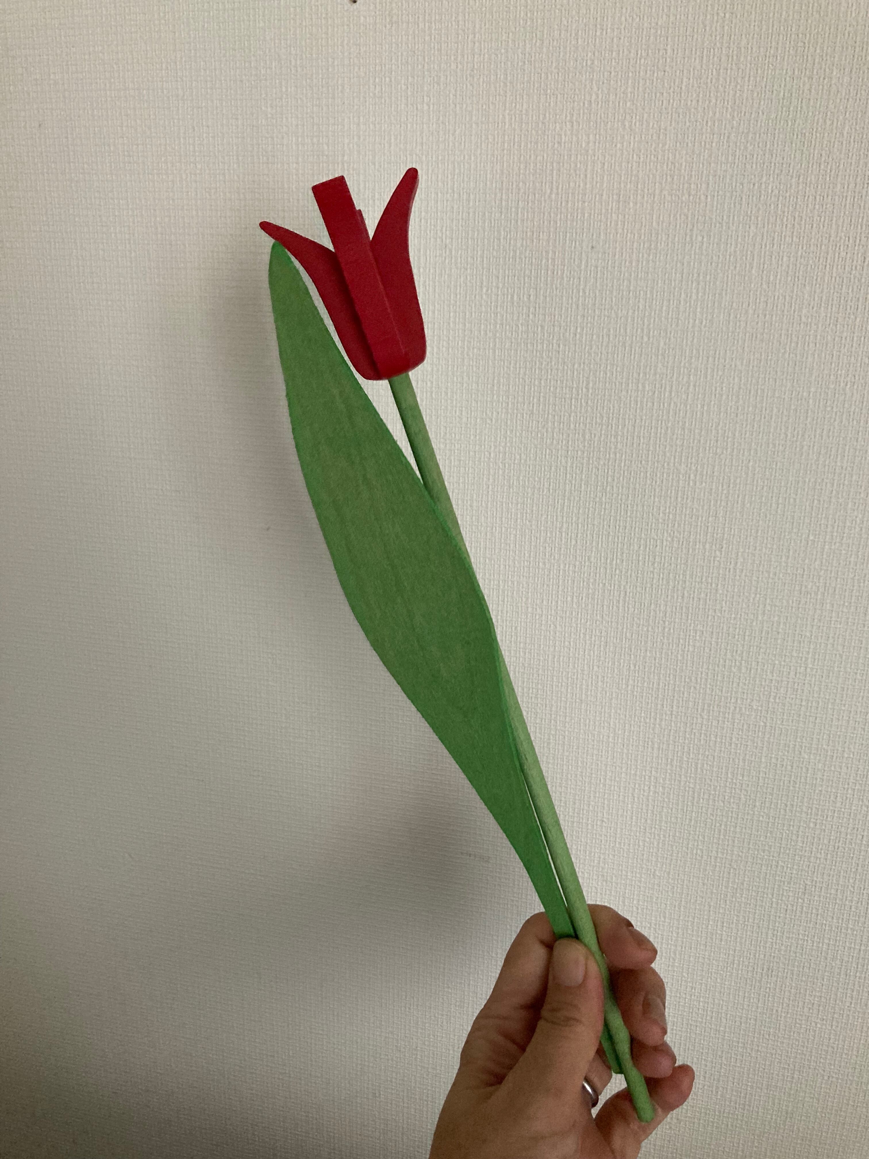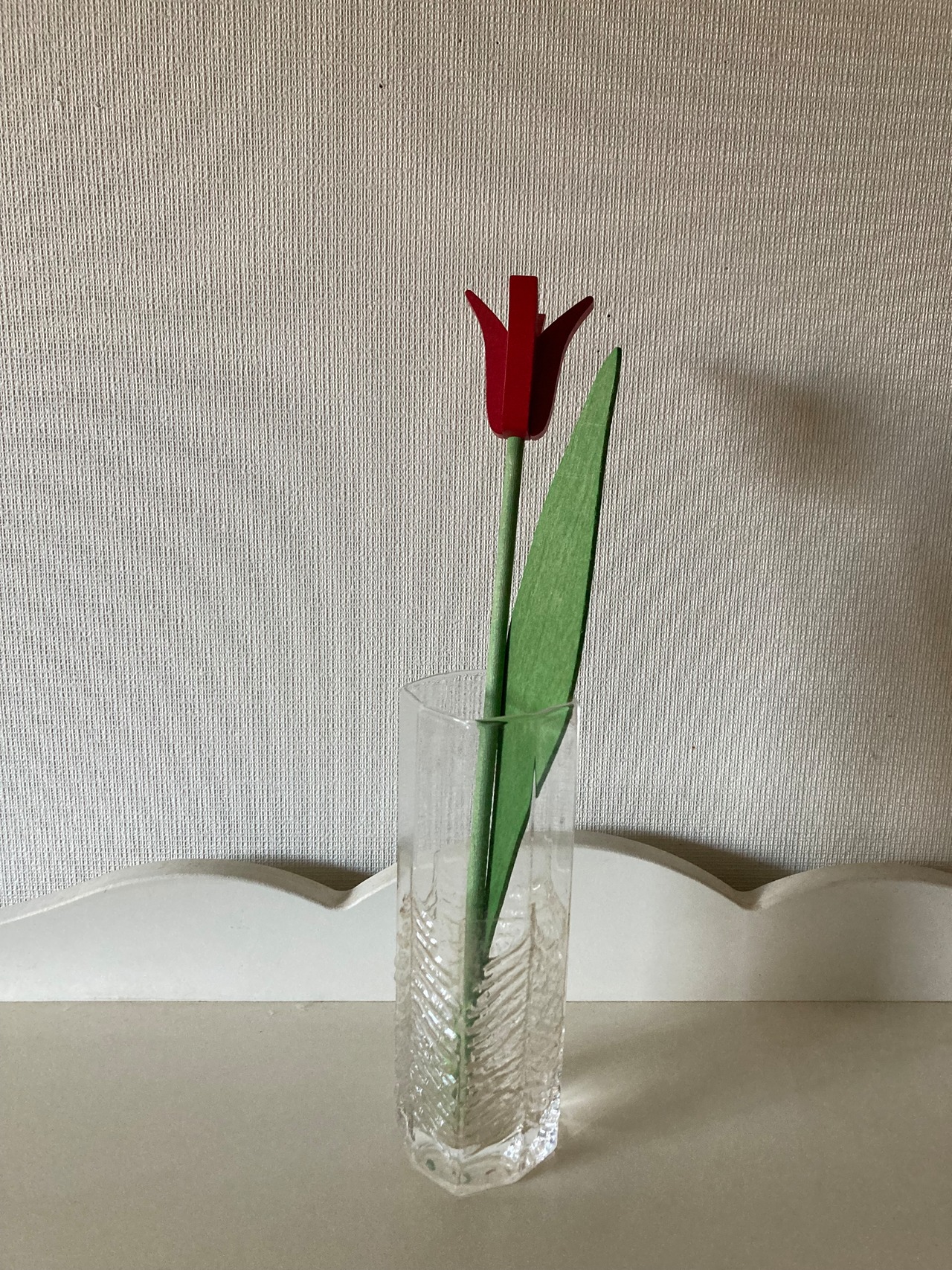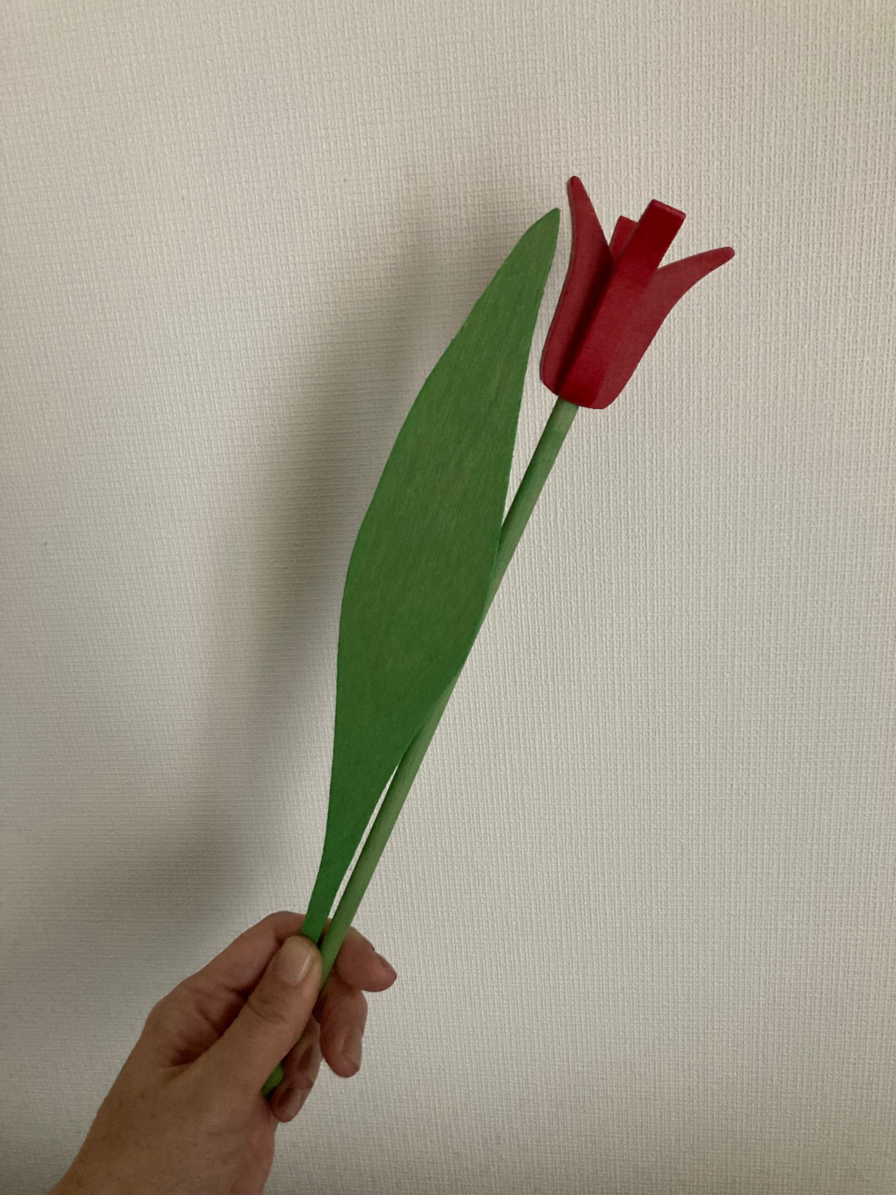 木製の葉っぱと茎のグリーンに、赤いチューリップが可愛らしいてす♫